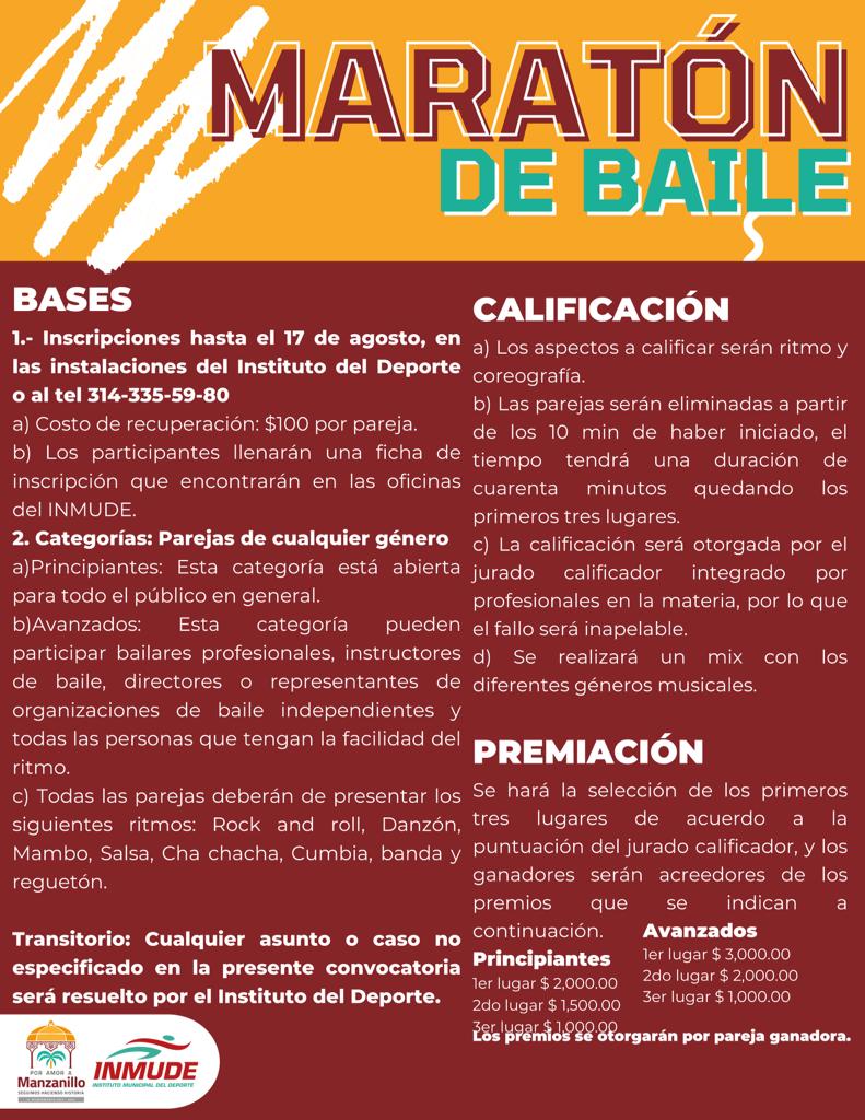 En el marco de las Jornadas por la Paz que se realizarán el próximo sábado en el malecón del Espíritu Santo, el Ayuntamiento de Manzanillo a través del Instituto Municipal del Deporte, en esa misma sede convoca a la población en general a participar en el Maratón de Baile. Las y los mejores podrán ganar premios económicos.