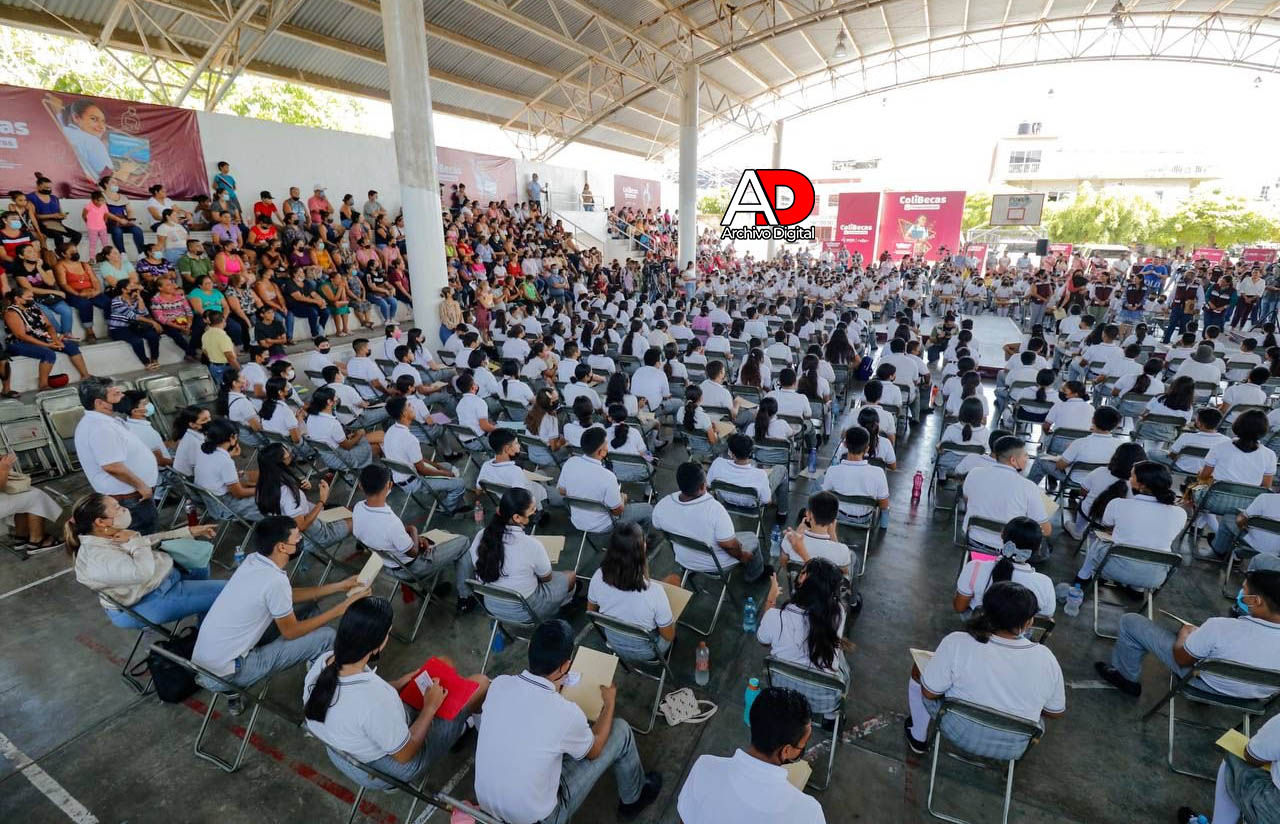 Dijo que además, en preescolar y primaria entregan ColiBecas-Mochilas y útiles escolares; en secundaria con ColiBecas-Computadoras por la necesidad de acceso a tecnologías para tareas e investigaciones; pidió a las y los beneficiarios que convenzan a quienes se salieron de la secundaria, que les digan que regresen y contarán con uniforme y computadora; “hay jóvenes, niñas y niños que abandonan la escuela por falta de recursos en casa para uniformes, zapatos, útiles escolares y no digamos una computadora”.