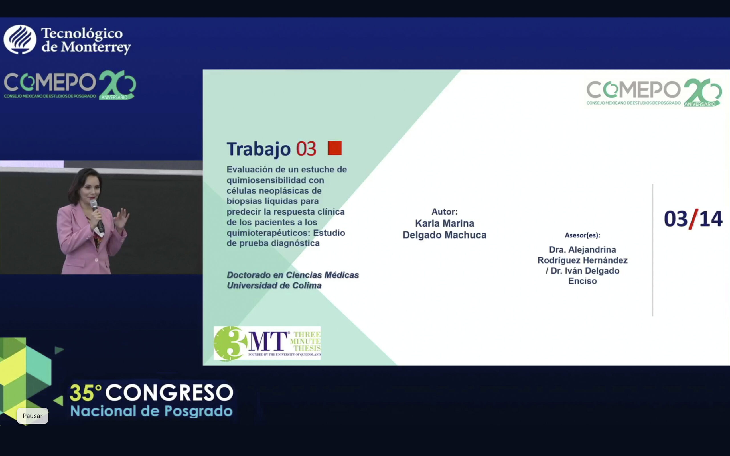 Karla Marina Delgado Machuca, estudiante del doctorado en Ciencias Médicas de la Universidad de Colima, ganó el Premio que Otorga el Público en el concurso nacional 3MT (Tesis en 3 Minutos), que convoca el Consejo Mexicano de Estudios de Posgrado (COMEPO), y que se llevó a cabo de manera presencial en instalaciones del Tecnológico de Monterrey, Nuevo León.