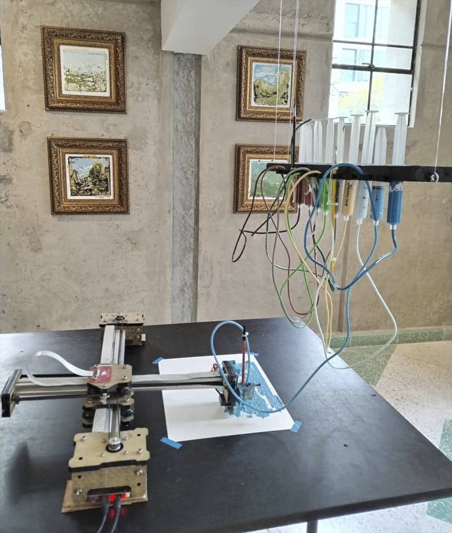 “Es -destacó- como una traducción de lenguajes que viene de la pintura al óleo tradicional con las que se entrena una inteligencia artificial que genera paisajes digitales, que las traduce a vectores y, por último, a una salida análoga otra vez con pintura al óleo”.