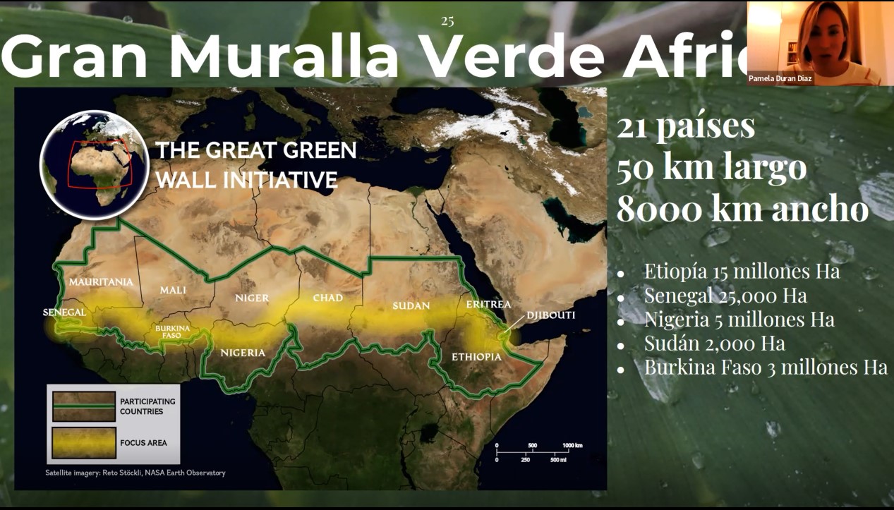 Por ultimo habló del proyecto de la gran muralla verde africana, en la que 21 países colaboran en la reforestación de ocho mil kilómetros de largo y 15 de ancho: “Esta iniciativa busca transformar la vida de millones de personas creando un mosaico de paisajes verdes y productivos”.