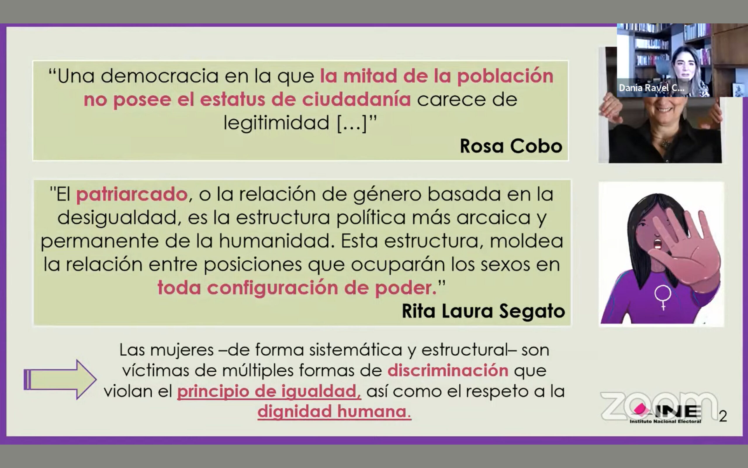 En su presentación, comentó que al hablar de democracia se debe pensar en la posibilidad y derecho que tienen todas las personas de pertenecer a un régimen democrático para poder participar activamente en las elecciones y ejercer sus derechos; “sin embargo, hemos sido víctimas en múltiples formas de discriminación que violan el principio de igualdad, así como el respeto a la dignidad humana; esto lo podemos ilustrar muy bien cuando hablamos de cómo se excluyó a las mujeres de su derecho a votar y ser votadas, cómo se les excluía del derecho a tener una educación universitaria o llegar a cargos públicos a través de estrategias como el asunto de las llamadas ‘Juanitas’”.