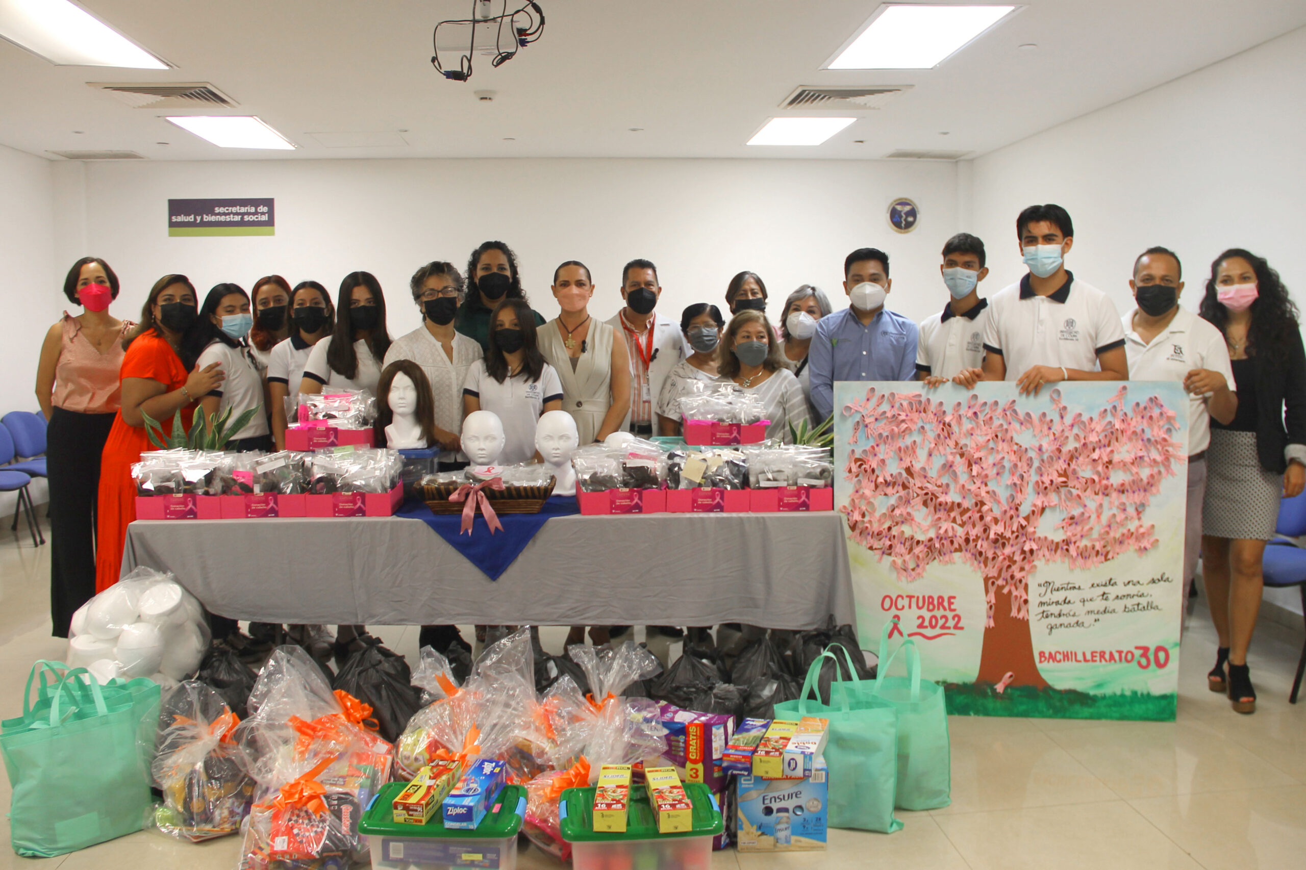 Además, destacó que la comunidad universitaria se sumó a las actividades de prevención, por lo cual entregaron un cuadro hecho por estudiantes del Bachillerato 30 de la UdeC; “en este cuadro, llamado el Árbol de la Vida, cada estudiante colocó un listón rosa con un mensaje de solidaridad para las y los paciente con cáncer, niños o adultos”.