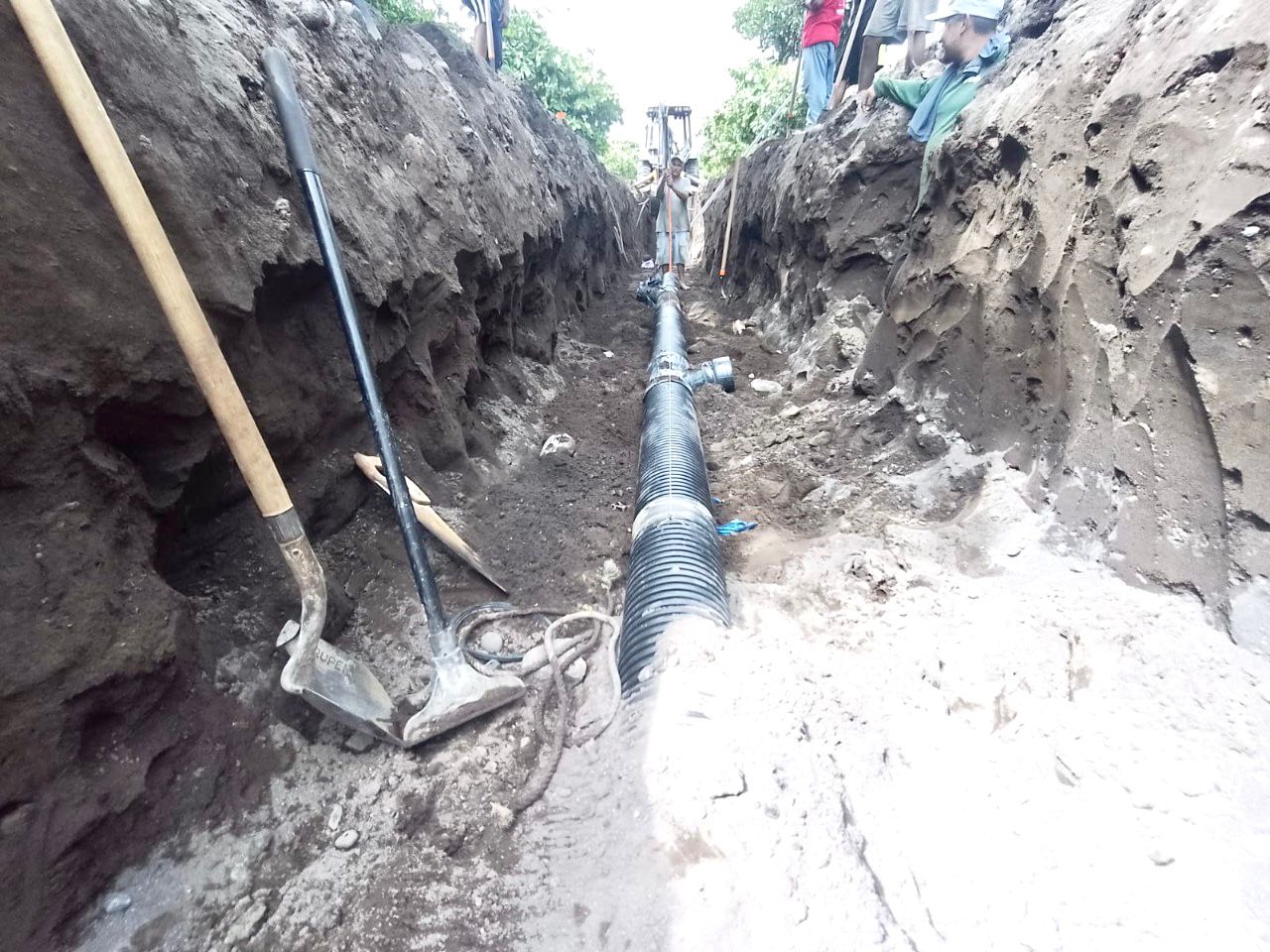 Prosiguiendo con la obra de rehabilitación del colector sanitario, se concluyó con 443.25 metros lineales de tubería de polietileno de 18”, 422 metros lineales de tubería de polietileno de 8”, 360 metros lineales de tubería de polietileno de 6” para descargas domiciliarias, 85 pza de tee wye, 69 pza de registros de descargas, 5 pza de pozos de visita, 16 m2 de empedrado ahogado en concreto y 19 metros lineales de muro de piedra con concreto.