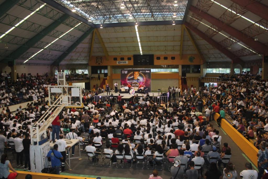 “Mis respetos para usted Tey”, le expresó Julio César Chávez a la Presidenta Municipal en el Polideportivo Universitario del campus Villa de Álvarez, donde ofreció la charla, el cual estuvo totalmente lleno.