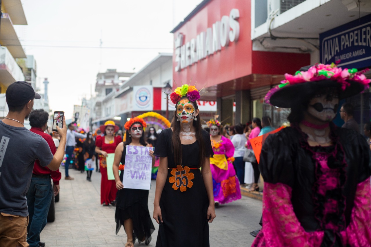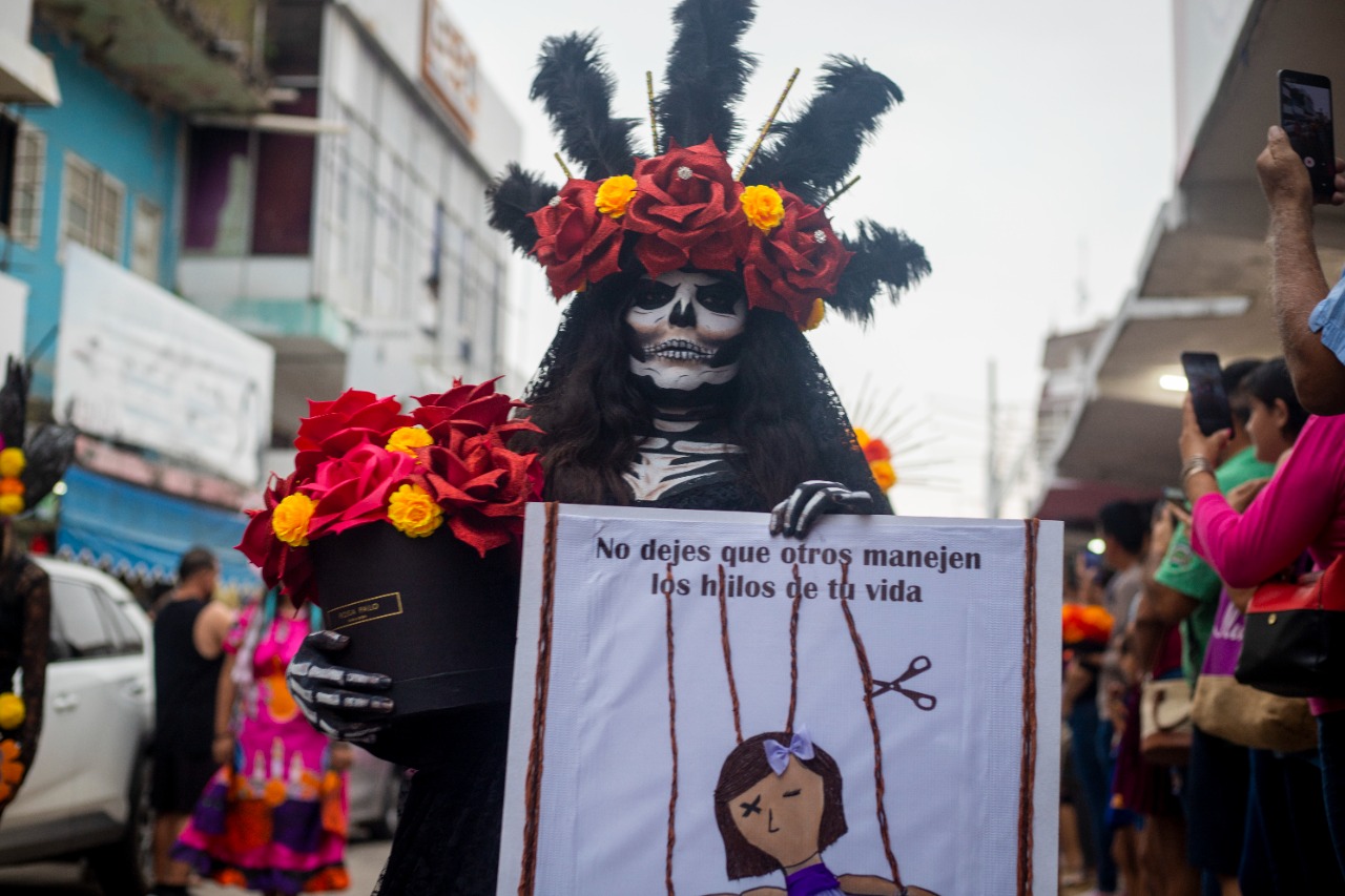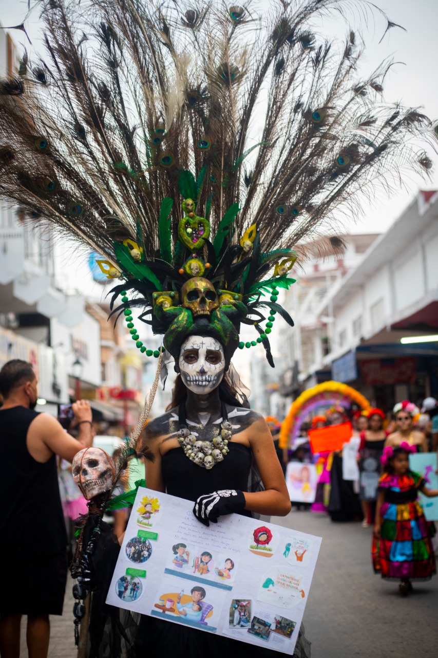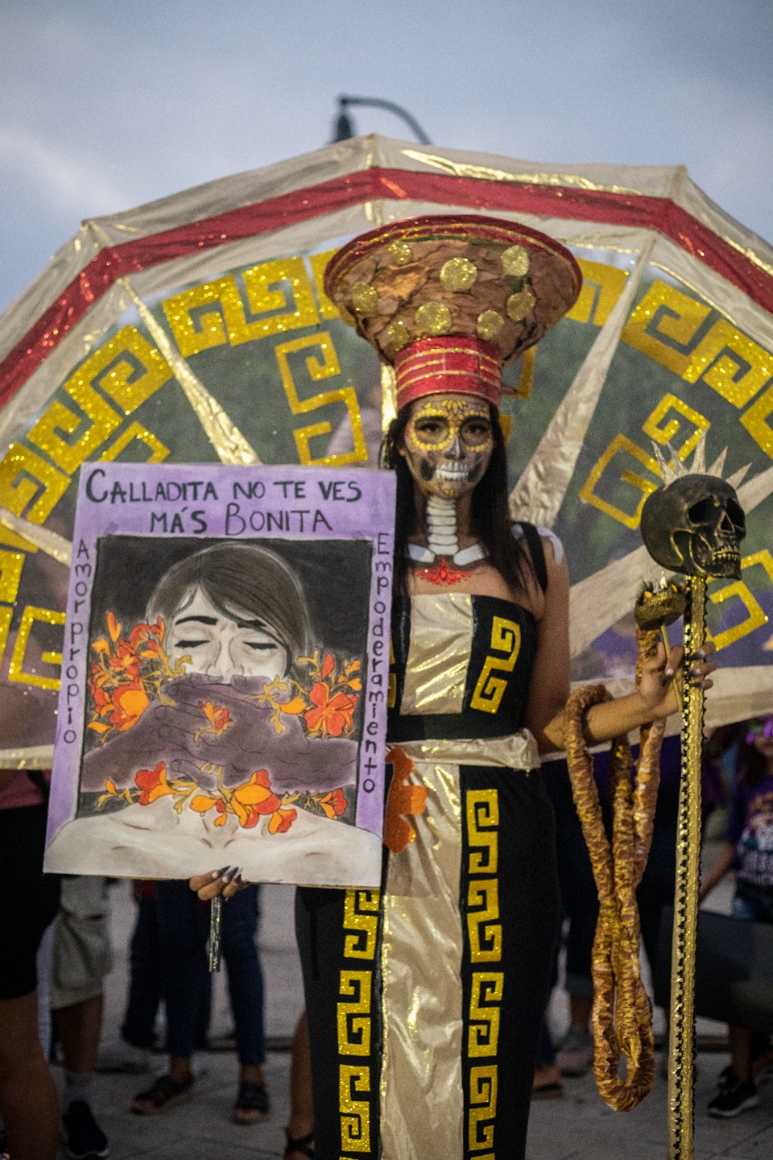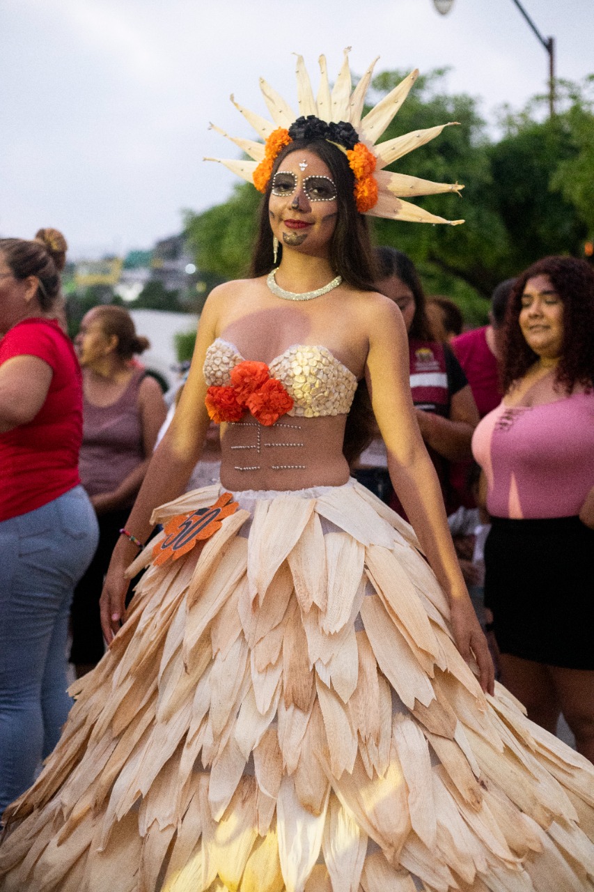 En su solemne recorrido, las bellas catrinas, portaban pancartas con mensajes de sororidad e igualdad, llamados a la prevención de las violencias de género. Ellas en un lento andar llegaron a la Plaza del Pez Vela donde fueron evaluadas por el jurado calificador.