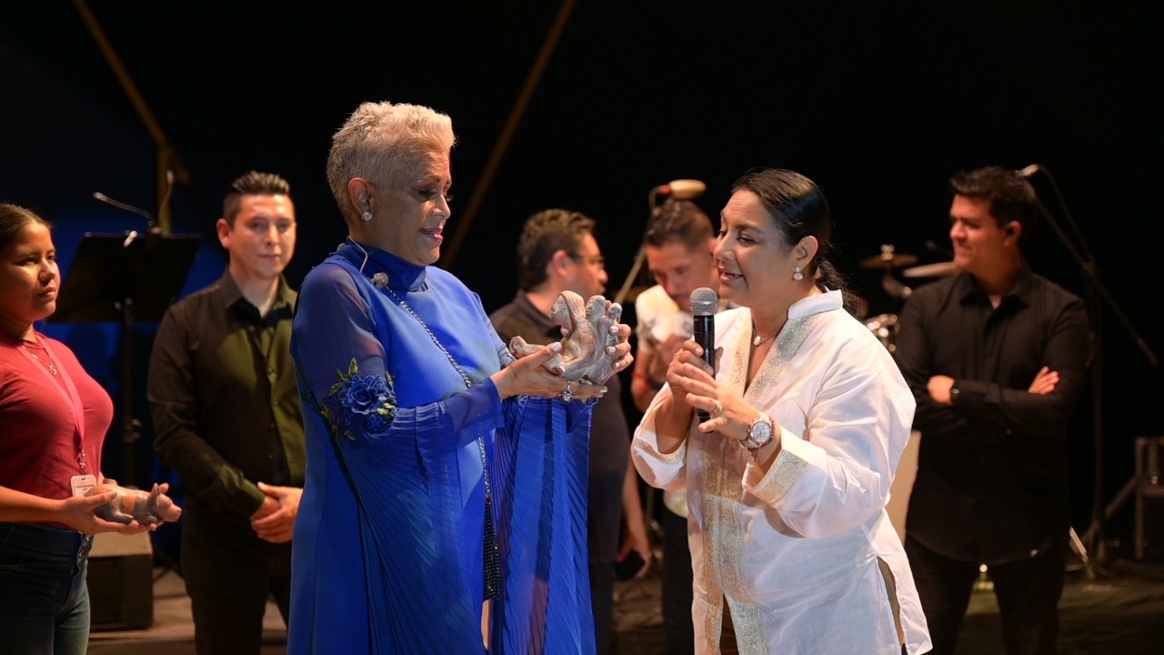 La presidenta Griselda Martínez al agradecer la visita de la cantante, le entregó un reconocimiento y réplicas de piezas arqueológicas de la región por su participación en este Festival que hace honor a las personas que ya se han ido.