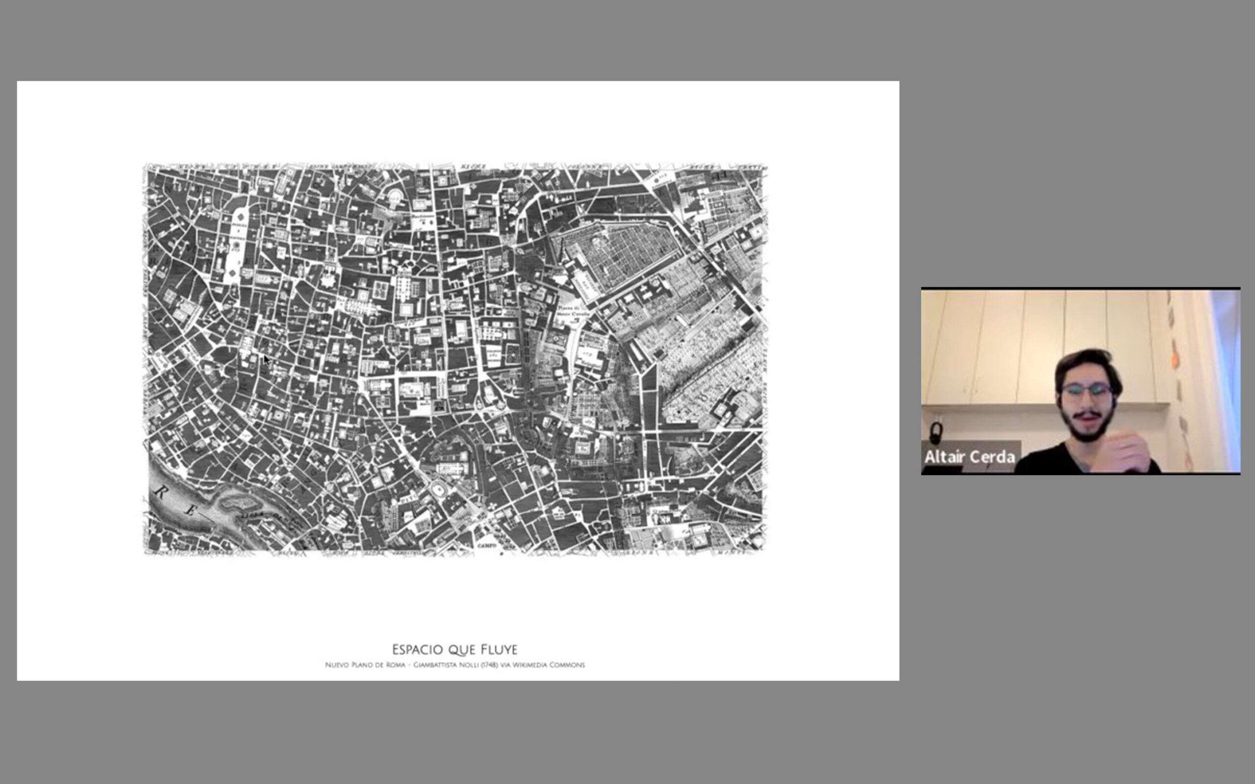 En la charla, el Mtro. Altair habló sobre los espacios públicos, cómo se da en ellos la interacción y para qué se utiliza. Dio como ejemplo una imagen de Giambattista Nolli, quien realizó el nuevo plano de la ciudad de Roma en 1748; en ella, Nolli representa los espacios públicos cerrados y los espacios públicos abiertos. Destacó cómo en dicho plano se señalan en color negro los espacios privados y en blanco los lugares donde las personas podían transitar (basílicas, iglesias).
