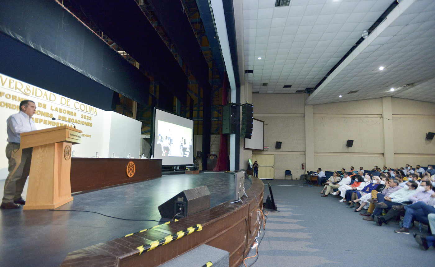 En nombre de la delegada de Manzanillo y de los delegados de Villa de Álvarez, Coquimatlán y Colima, el delegado del campus Tecomán, Carlos Alberto Montes Carbajal rindió el informe de labores de lo hecho por estas dependencias a lo largo del año, en un acto celebrado este lunes en el Paraninfo Universitario.