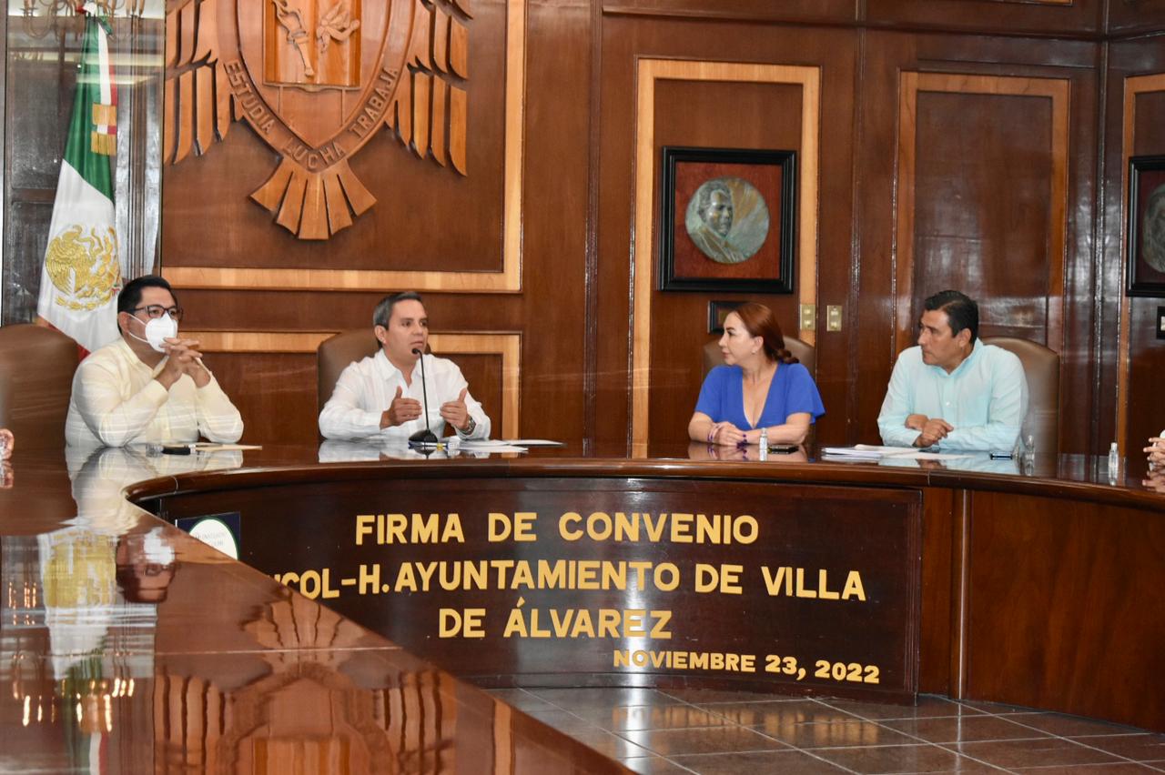 Colima, Col.- La Universidad de Colima y el Ayuntamiento de Villa de Álvarez firmaron un convenio de colaboración que en su fase inicial contempla la participación de la Máxima Casa de Estudios Colimense en la Estrategia Entornos Seguros, en la reapertura del módulo de la Cruz Roja en la colonia Villas de la Tuna y en una evaluación externa del primer año de gobierno municipal.