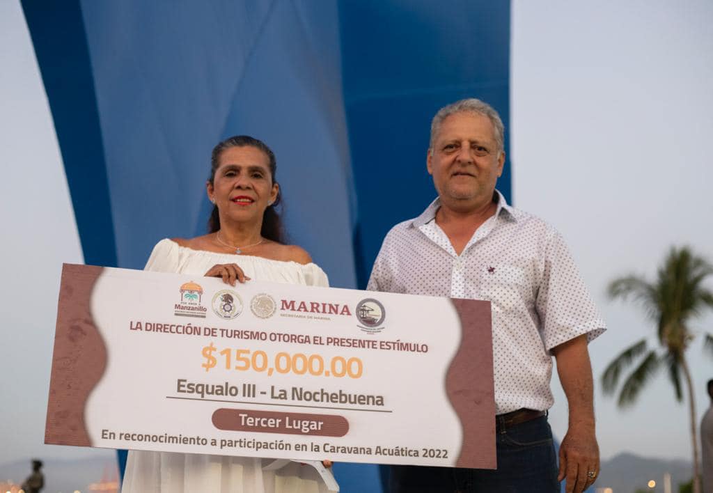 Igual que el año pasado, la presidenta de Manzanillo, Griselda Martínez hizo entrega de una bolsa de 650 mil pesos en premios para las embarcaciones ganadoras de la segunda Caravana Acuática que se realizó el pasad o 31 de diciembre por la bahía manzanillense.