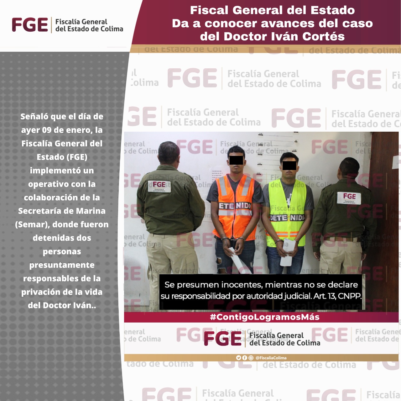 Primeramente, señaló que el día de ayer 09 de enero, la Fiscalía General del Estado (FGE) implementó un operativo con la colaboración de la Secretaría de Marina (Semar), donde fueron detenidas dos personas presuntamente responsables de la privación de la vida del Doctor Iván.