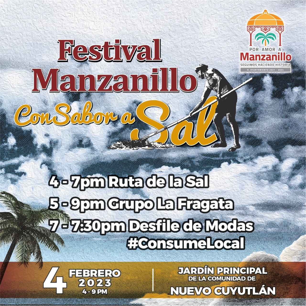 Para los detalles de esta segunda edición del Festival Manzanillo con Sabor a Sal, Nora Sepúlveda indicó que el próximo 04 de febrero de 4 a 9 de la noche en la comunidad de Nuevo Cuyutlán se podrán disfrutar de varias actividades, “el primer punto de reunión es a las 4 de la tarde en las salineras de la empresa Sal Real de Colima, la cual está pasando la comunidad de San Buenaventura. Ahí se podrá conocer todo el proceso para la obtención de la sal”.