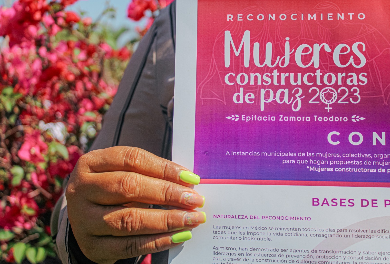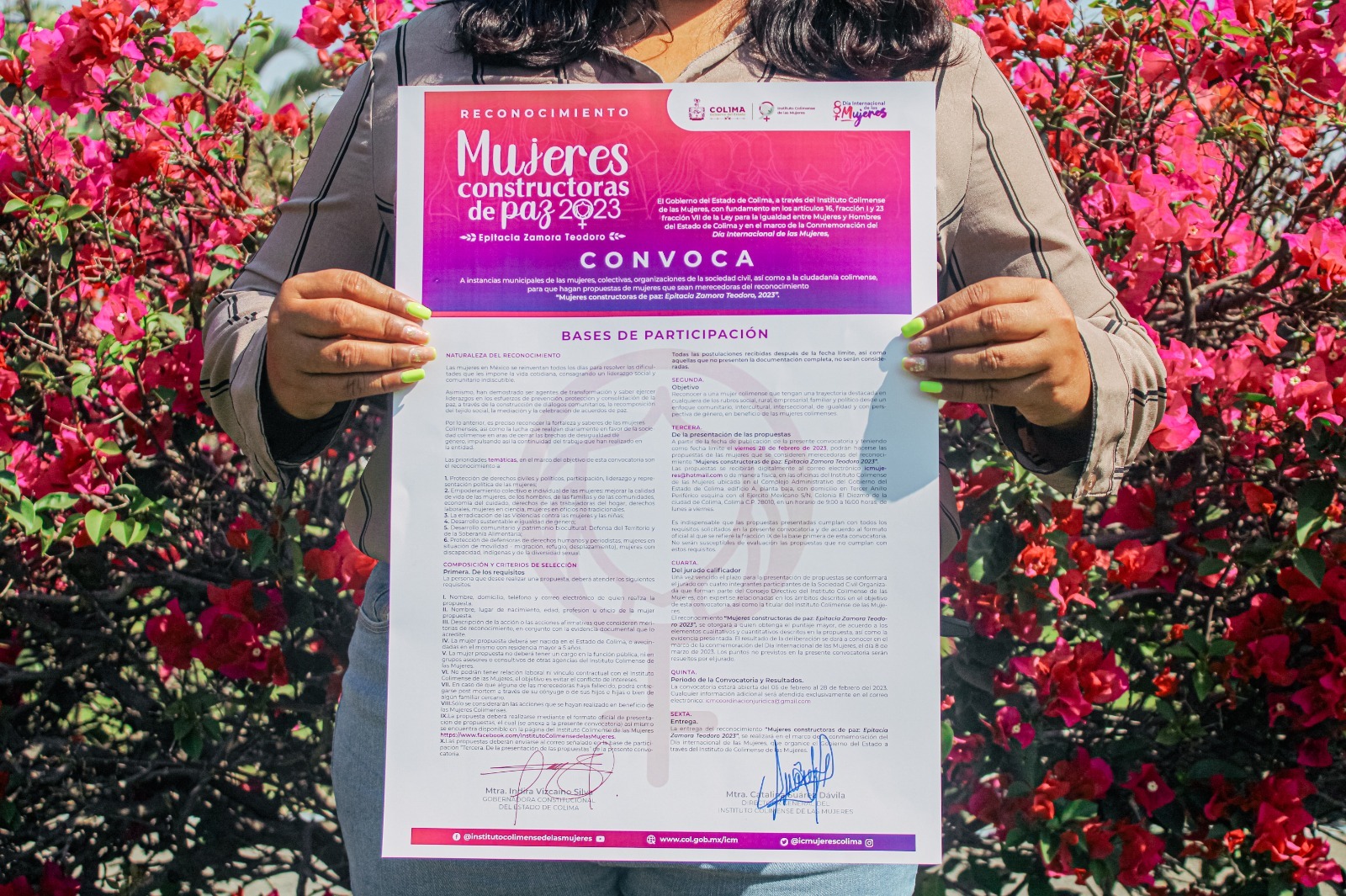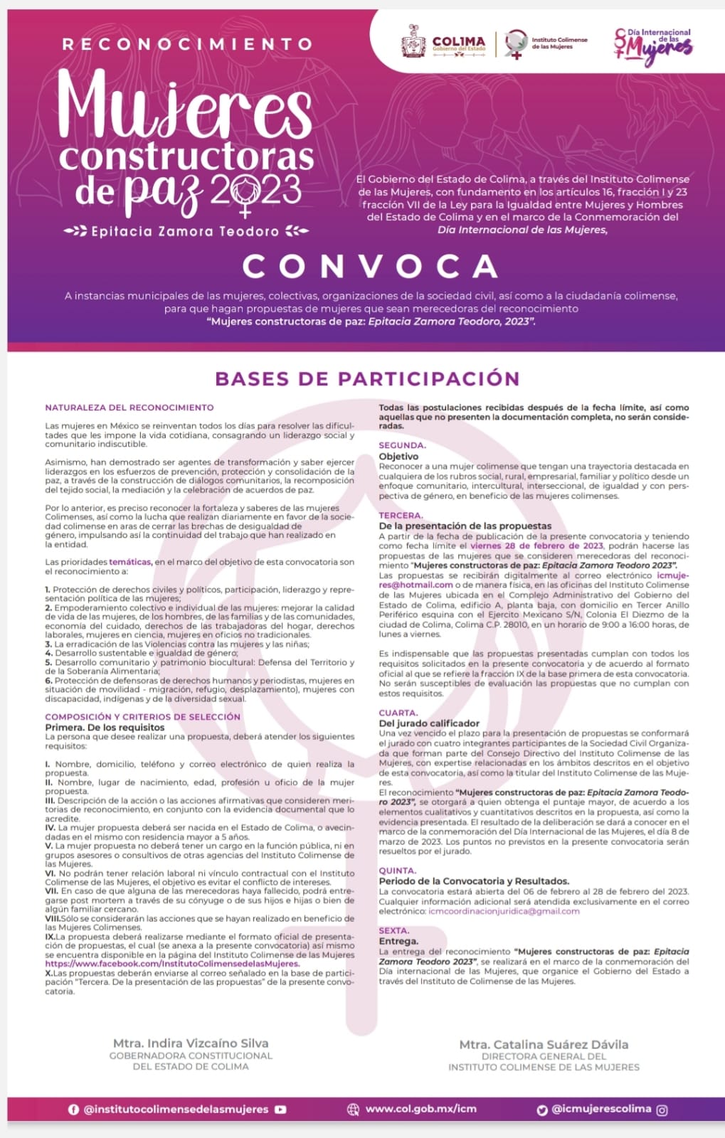 El Gobierno del Estado de Colima, a través del Instituto Colimense de las Mujeres (ICM), emitió este miércoles la convocatoria para el reconocimiento “Mujeres Constructoras de Paz 2023: Epitacia Zamora Teodoro”, que distingue el trabajo de colimenses destacadas en los ámbitos: social, político, económico, empresarial, científico, defensa de los derechos humanos, protección del medio ambiente y salud pública, desde un enfoque intercultural, interseccional, comunitario, de igualdad y con perspectiva de género, en beneficio de las mujeres colimenses.