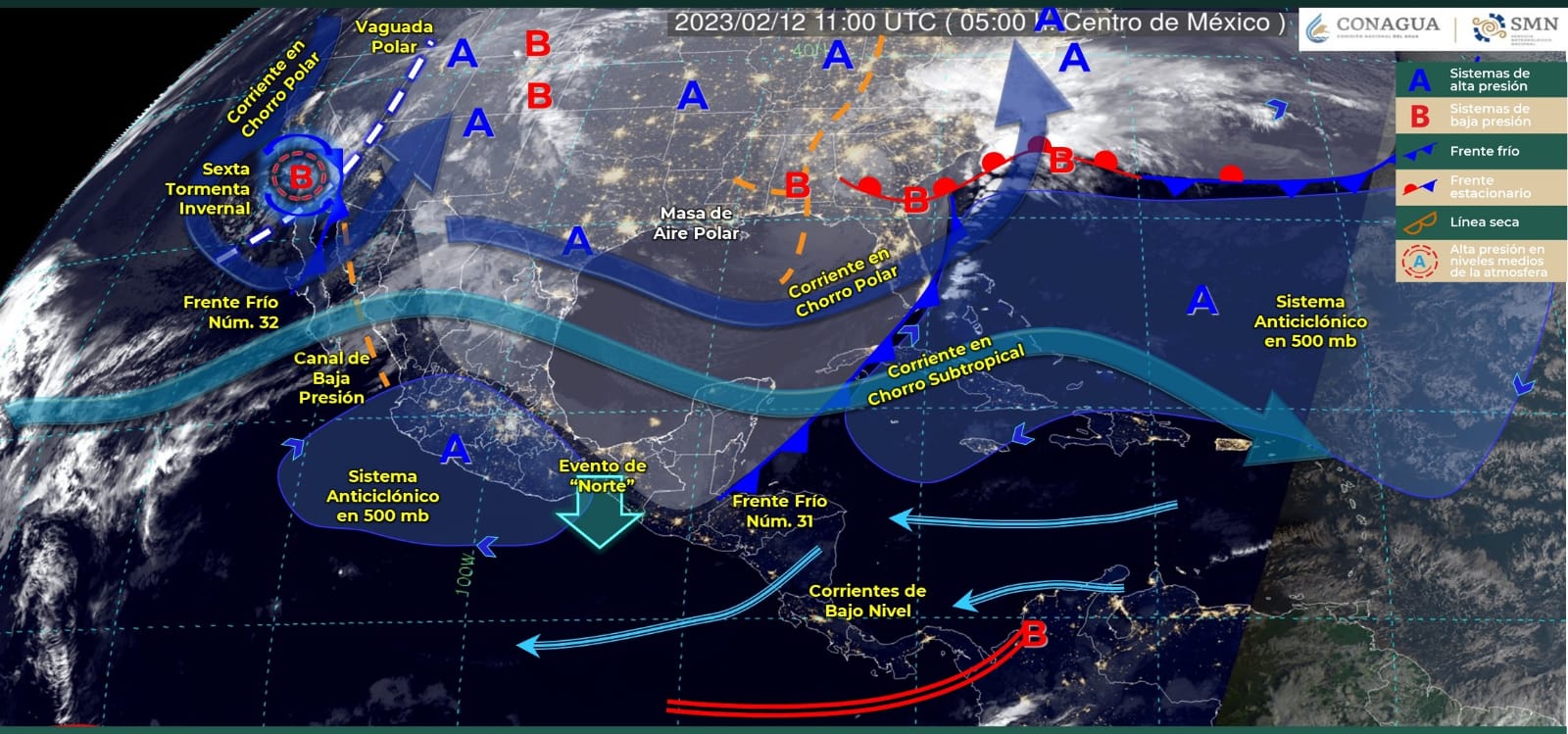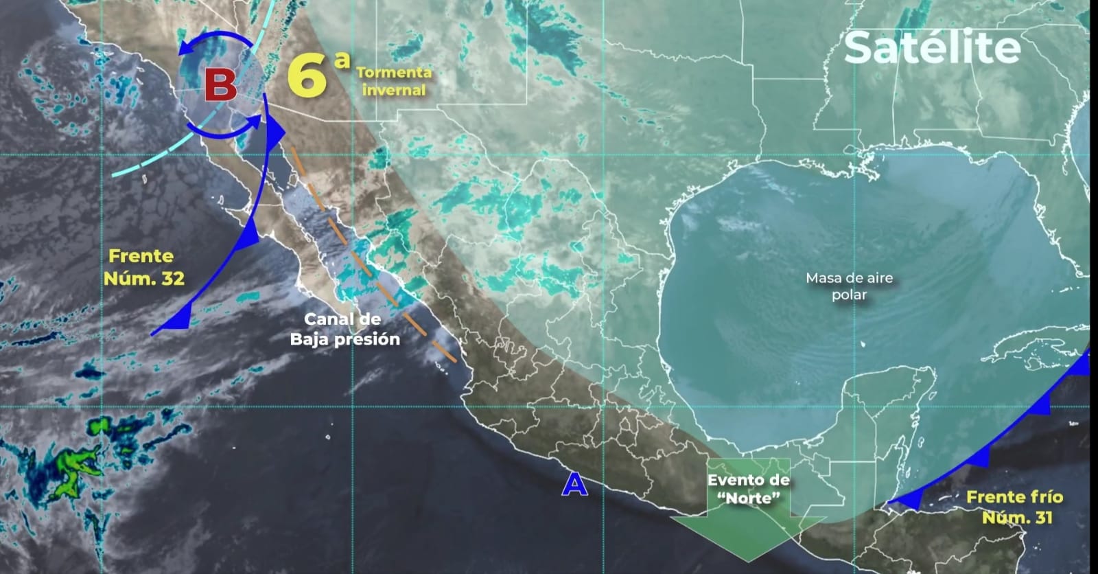 En contraste, las temperaturas mínimas hoy serían de -15 a -10°C con heladas en zonas montañosas de Chihuahua y Durango; de -10 a -5°C en Baja California, Sonora, Coahuila, Nuevo León, San Luis Potosí y Zacatecas; y de -5 a 0°C en Tamaulipas, Aguascalientes, Jalisco, Michoacán, Guanajuato, Querétaro, Hidalgo, Estado de México, Tlaxcala, Puebla, Veracruz y Oaxaca.