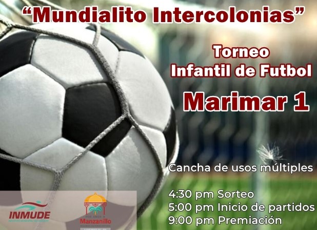 El Torneo infantil de futbol en Marimar 1 que se denomina “Mundialito Intercolonias”, dará inició en la cancha de usos múltiples a las 4:30 de la tarde, con el sorteo de equipos; el primer juego se llevara a cabo a las 5 de la tarde; se estima que termine a las 9 de la noche, ahí a ganadores se les premiará con las medallas correspondientes.