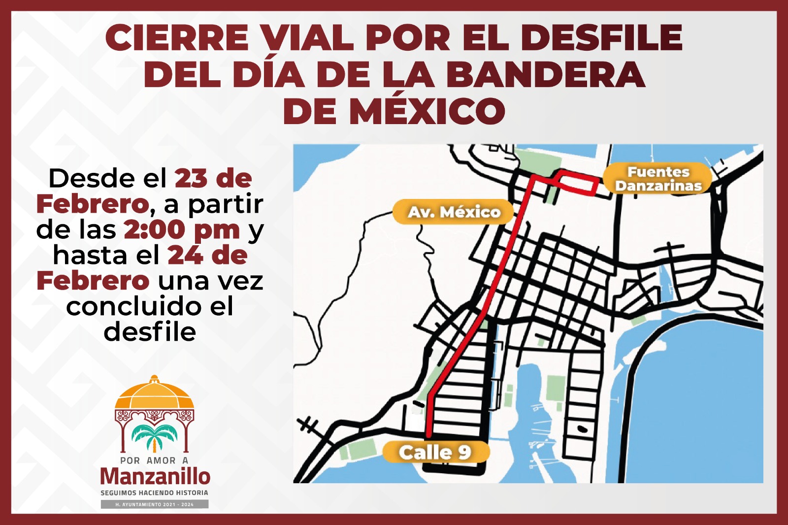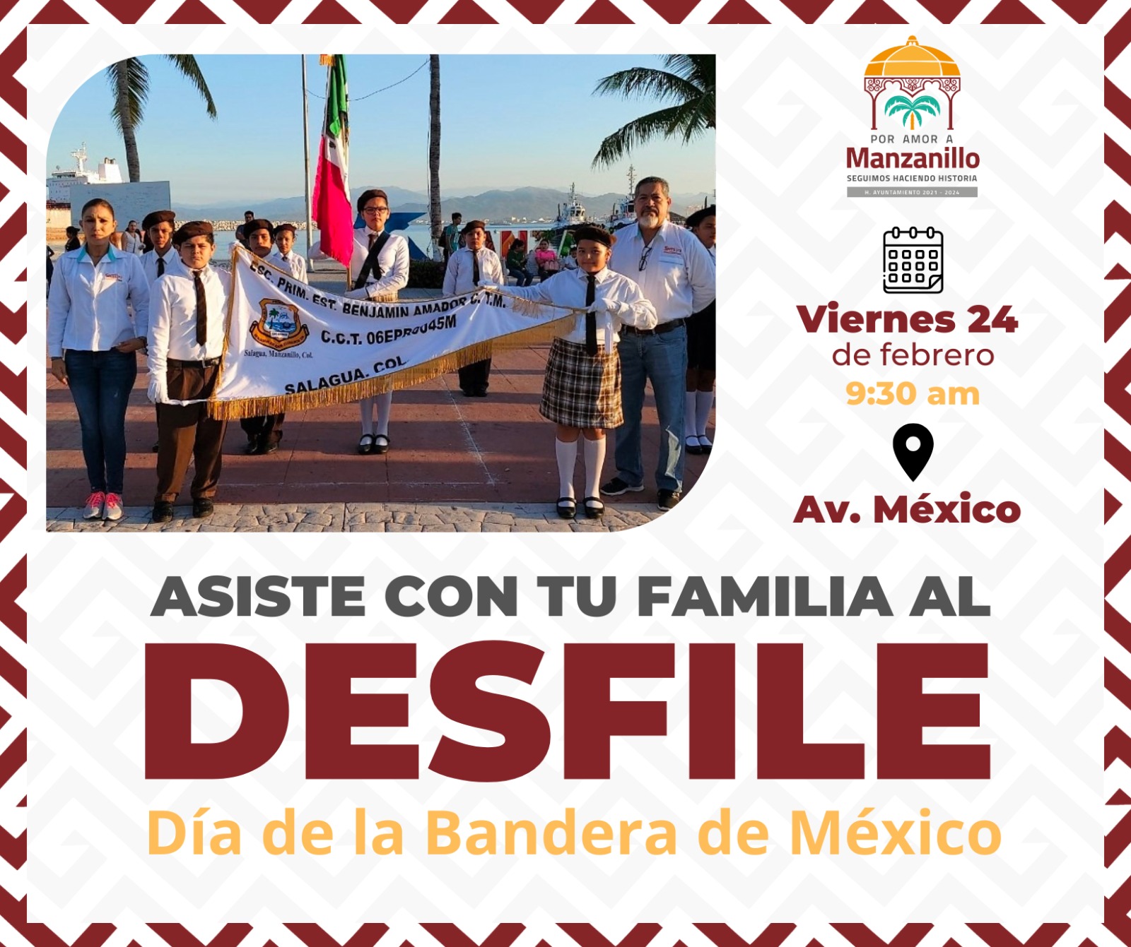 Este viernes 24 de febrero, sobre la Plaza Juárez y en calles del centro de Manzanillo, el Ayuntamiento conmemorará un año más de la bandera de México; en un primer momento, se realizará la ceremonia cívica y una vez concluida se dará paso al tradicional desfile.
