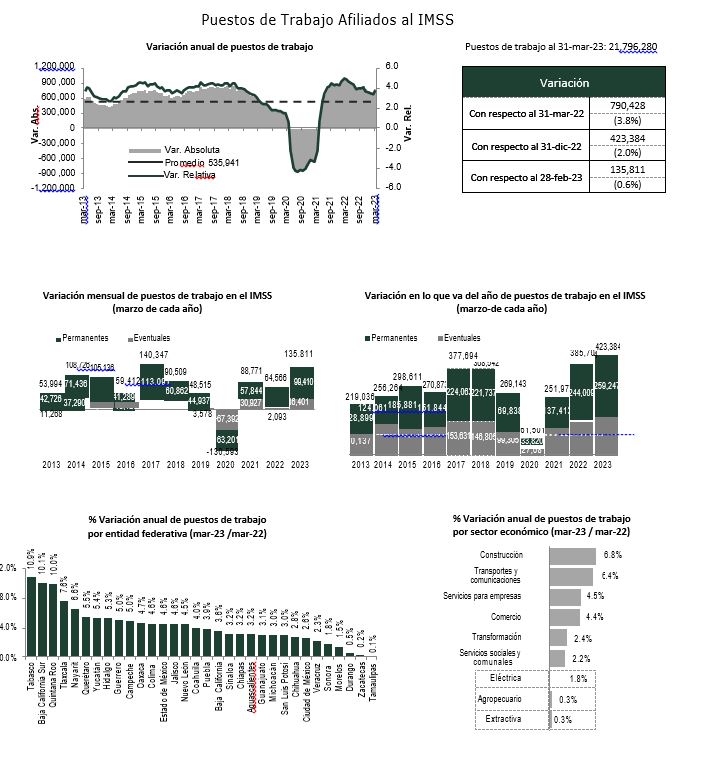 Al 31 de marzo de 2023, se tienen registrados ante el Instituto Mexicano del Seguro Social (IMSS) 21,796, 280 (veintiún millones setecientos noventa y seis mil doscientos ochenta) puestos de trabajo; de éstos, el 81% (ochenta y seis punto uno por ciento) son permanentes y el 13.9% (trece punto nueve por ciento) son eventuales.