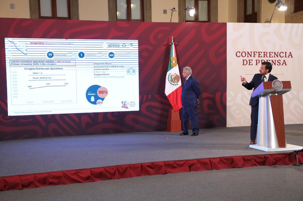 Señaló que en Sonora operan 17 hospitales con 33 quirófanos; el número de cirugías pasó de mil 786 a dos mil 164 en este primer trimestre, con lo que la productividad alcanzó 2.19 cirugías diarias. La inversión en el segundo nivel es de 608.8 millones de pesos y el surtimiento de recetas llegó a 98 por ciento.
