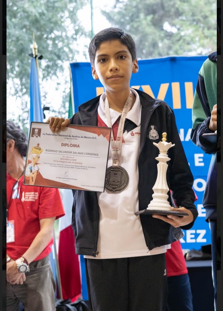 Rodrigo Salinas participó recientemente en la edición 68 del Campeonato Nacional e Internacional Abierto Mexicano de Ajedrez “Complejo Cultural Los Pinos 2023” en la Ciudad de México, celebrado del 4 al 9 de abril, donde se congregaron más de mil 500 ajedrecistas de 29 países en categorías infantiles, juveniles y abiertas.