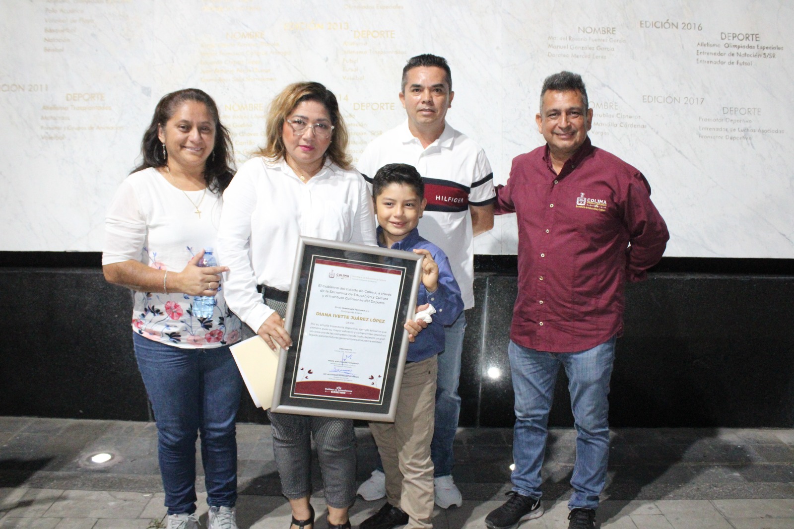 Rafael Valencia II, encargado de dar lectura a la reseña deportiva de la talentosa deportista de judo, resaltó las medallas logradas por Diana Ivette Juárez López en campeonatos nacionales e internacionales, donde sobresale el título panamericano de judo en 2016 y su ingreso al Muro de Honor del Deporte Colimense en 2014, donde está inscrito a perpetuidad su nombre con letras color oro.