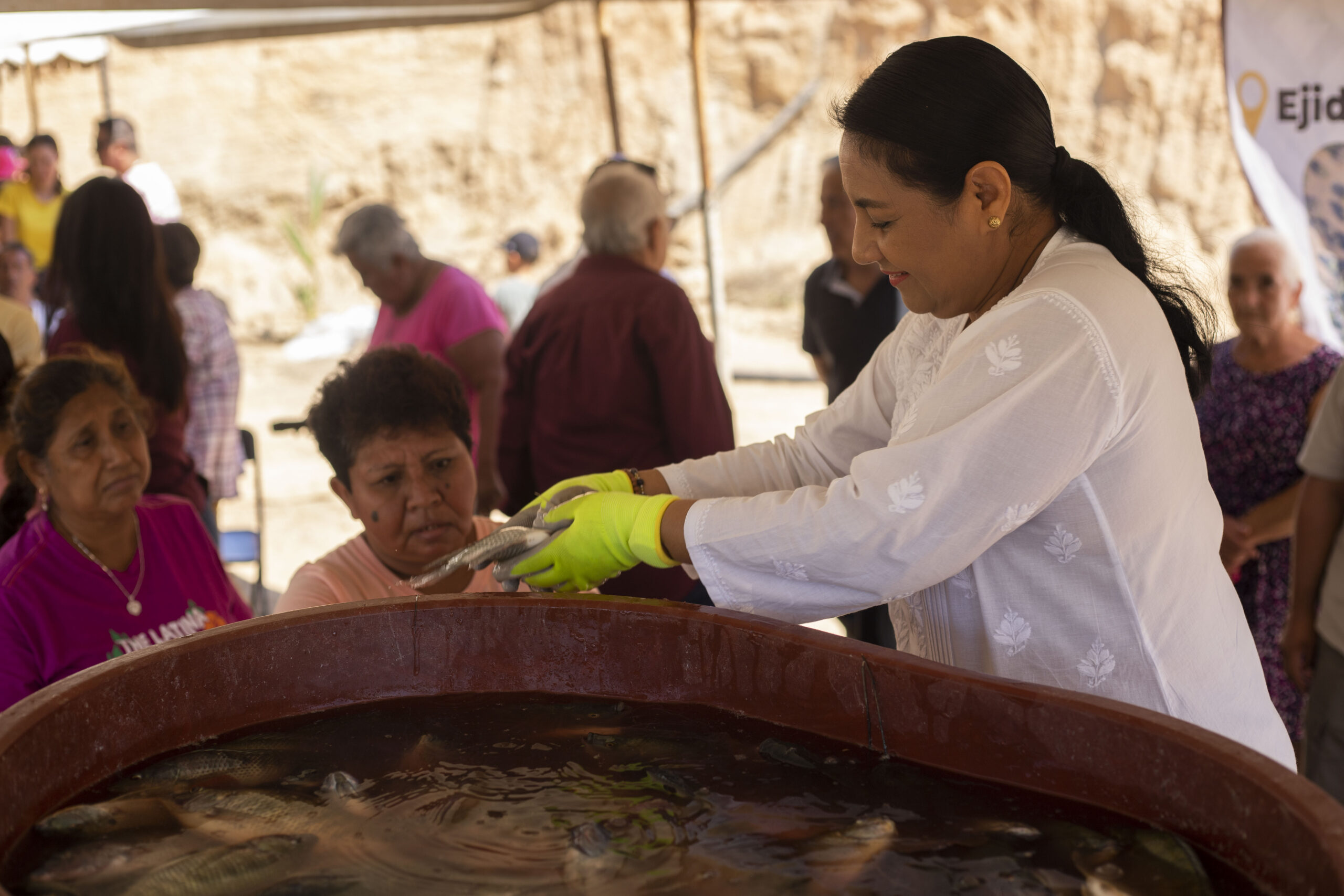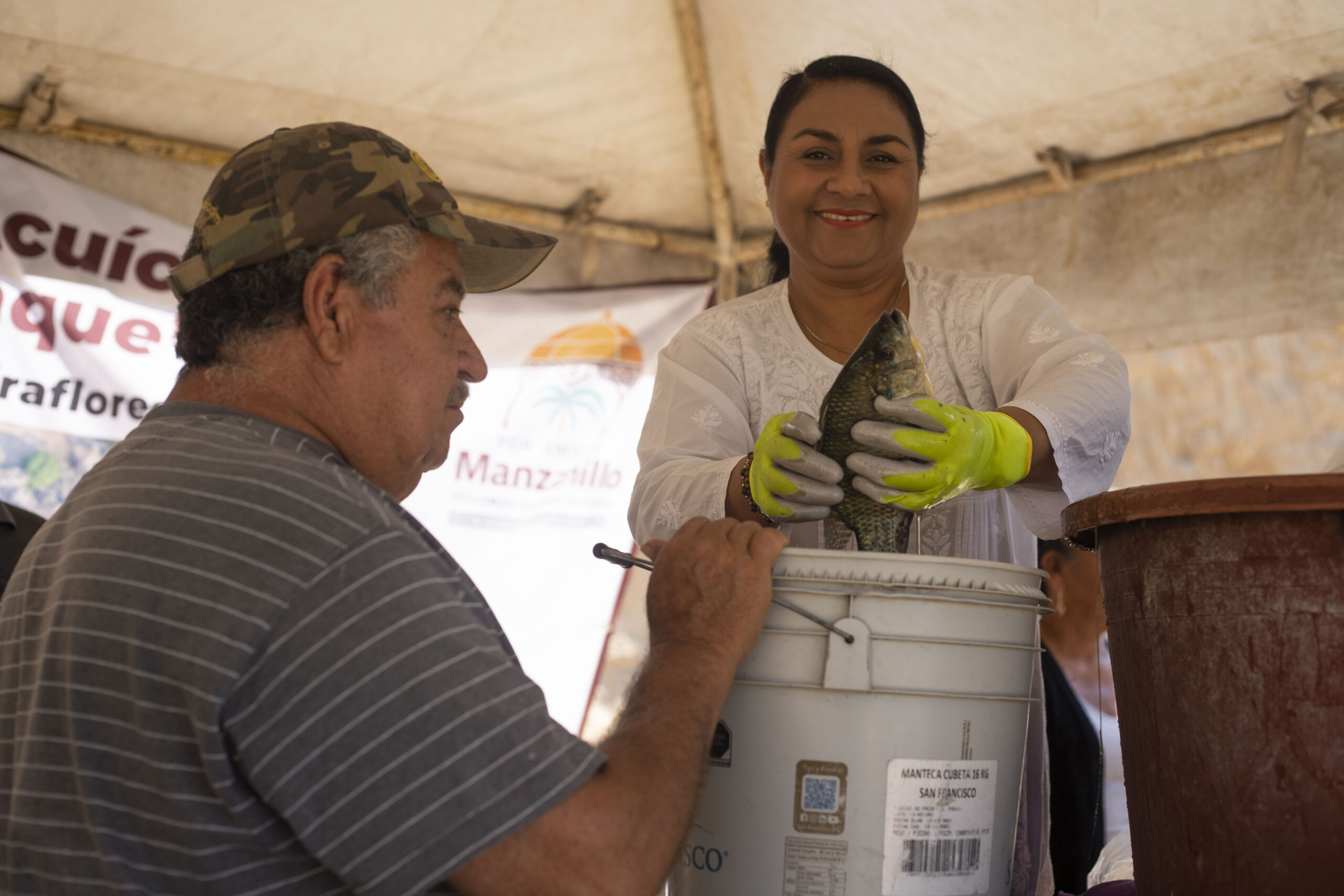 En su oportunidad la secretaria del Ayuntamiento, Martha Zepeda, reconoció la labor que hacen las personas en Camotlán para que se pueda producir, “hoy demuestran que son productivos para la comunidad y además generosos. Que esta primera cosecha de tilapia se multiplique”.