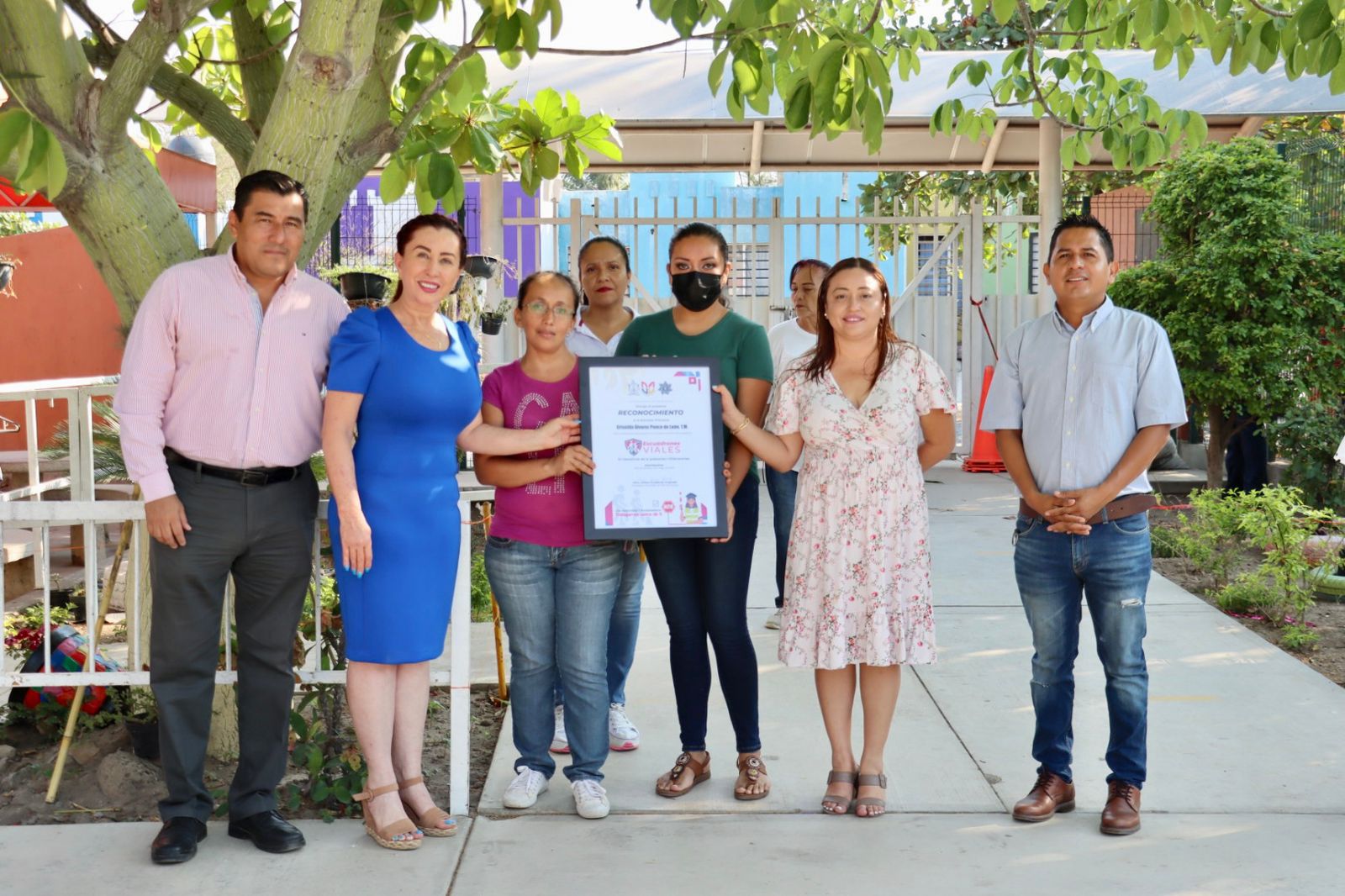 En la primaria Griselda Álvarez Ponce de León de la colonia La Reserva, la Alcaldesa entregó un reconocimiento a madres de familia y docentes por realizar acciones y participar en programas benéficos para la comunidad escolar y sus familias, asimismo les pidió que sigan trabajando coordinadamente en la suma de voluntades para seguir haciendo ese gran equipo que requiere el municipio.