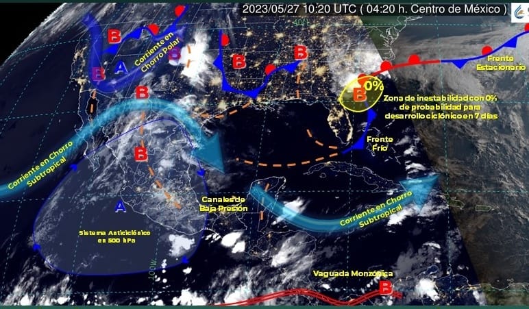 La Comisión Nacional del Agua (Conagua), fuente oficial del Gobierno de México, contempla para hoy lluvias aisladas de 0.1 a 5 milímetros, en Colima, Sonora, Tabasco, Campeche y Yucatán. Respecto a las temperaturas mínimas en el país este día descenderían de 0 a 5°C en las zonas montañosas de Baja California, Chihuahua y Durango.
