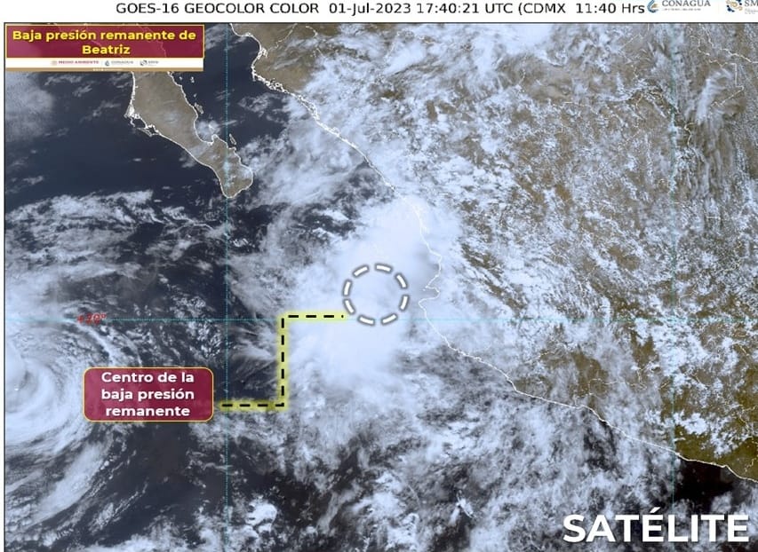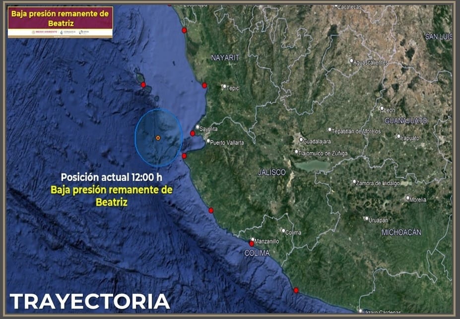 ‘Beatriz’, ahora como baja presión remanente, se localiza aproximadamente a 60 kilómetros al oeste-noroeste de Cabo Corrientes Jalisco y a 135 kilómetros al suroeste de San Blas Nayarit; presenta vientos máximos sostenidos de 45 kilómetros por hora (km/h), rachas de 65 km/h y desplazamiento hacia el noroeste a 19 km/h.