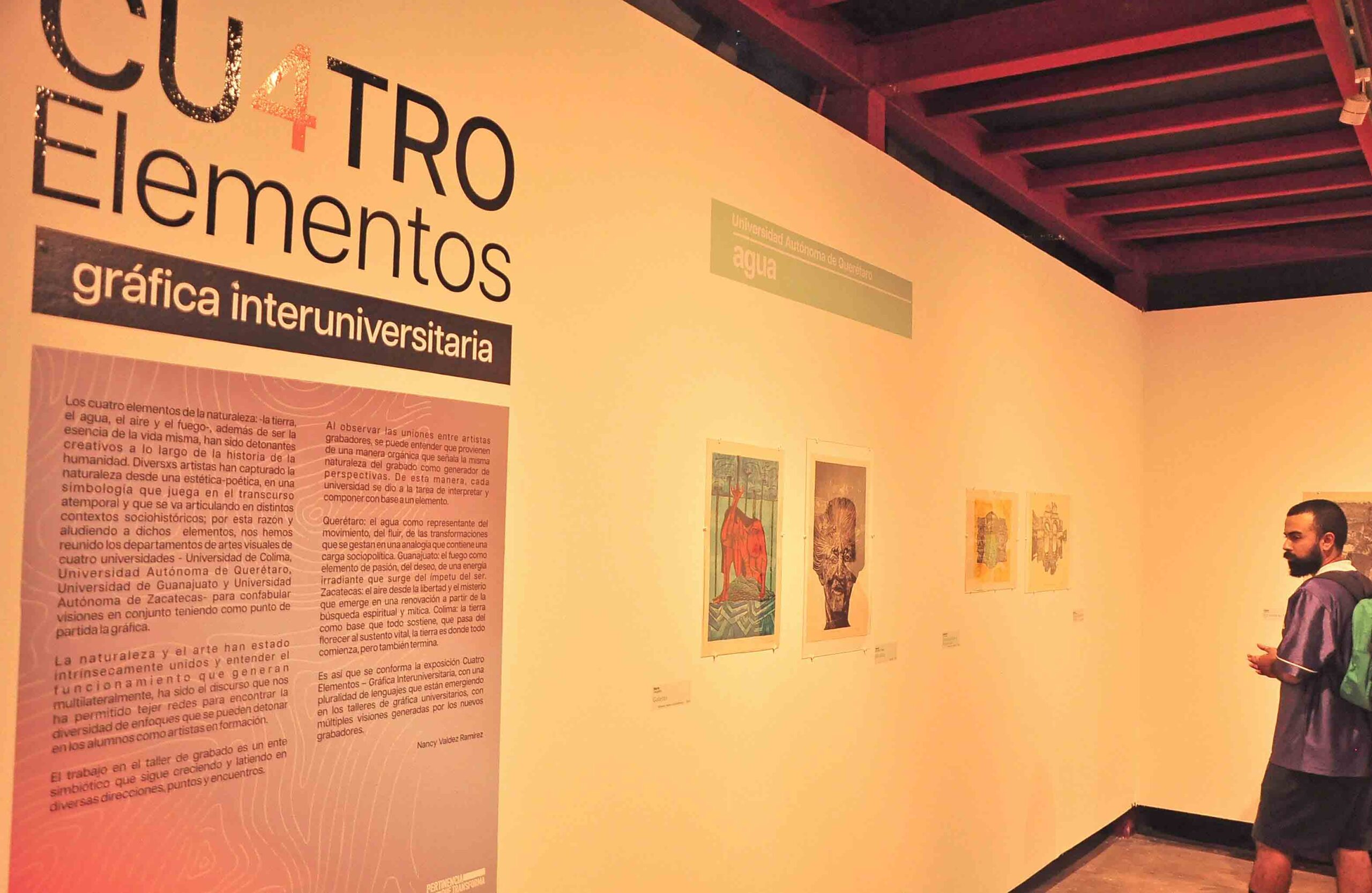Estudiantes de las universidades de Colima, Autónoma de Querétaro, Guanajuato y Zacatecas, unieron sus trabajos visuales para integrar la muestra: “Cuatro elementos, gráfica interuniversitaria”, que se inauguró esta semana en el Museo Fernando del Paso de la Universidad de Colima. Dicha exposición formará parte de las muestras de arte del Festival Cervantino de este año.