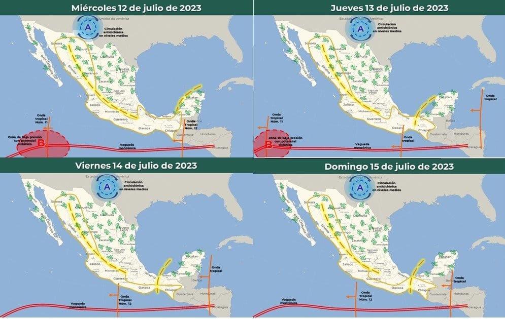 Respecto a las temperaturas este 12 de julio, la máxima superaría 45 grados Celsius en Baja California; de 40 a 45°C en Sonora, Chihuahua, Coahuila, Nuevo León y Tamaulipas; así como de 35 a 40°C en: Colima, Jalisco, Michoacán, Guerrero, Nayarit, Baja California Sur, Sinaloa, Durango, San Luis Potosí, Veracruz, Tabasco, Campeche, Yucatán y Quintana Roo.