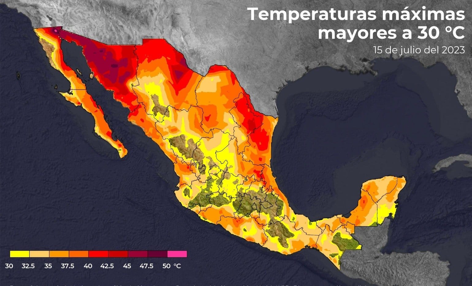En cuanto a las temperaturas máximas, Colima podría llegar a alcanzar los 40 grados Celsius, al igual que los estados de Baja California Sur, Sinaloa, Nayarit, Jalisco, Michoacán, Guerrero, Oaxaca, Chiapas, Durango, Tabasco y Quintana Roo.