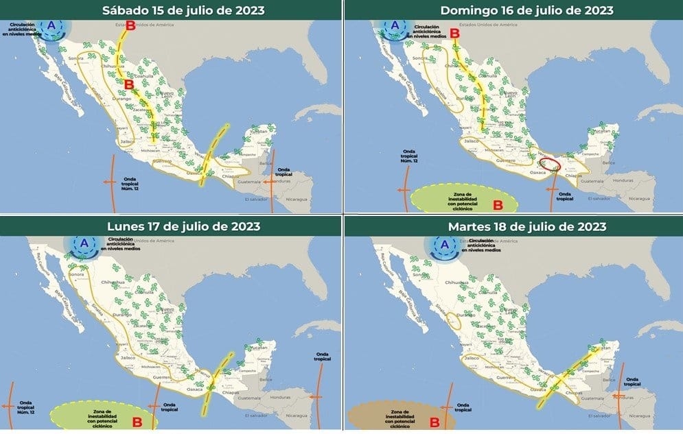 Para este sábado 15 de julio, el organismo dependiente de la Comisión Nacional del Agua (Conagua) prevé que en Colima podrían registrarse intervalos de chubascos de entre 5 y 25 milímetros, lo mismo para Michoacán, Estado de México, Ciudad de México, Tabasco, Campeche, Yucatán y Quintana Roo.