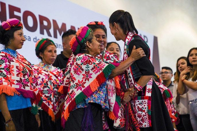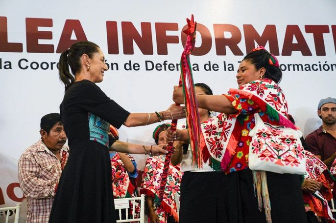 En un recinto lleno de simpatizantes de la Huasteca Potosina, Aquismón, Matlapa, Xilitla, Tamazunchale, Tancanhuitz, Ciudad Valle, entre otros lugares de San Luis Potosí, Claudia Sheinbaum recibió el Bastón de Mando por parte de los pueblos originarios de la región como muestra de respaldo para continuar con la Defensa de la Transformación.
