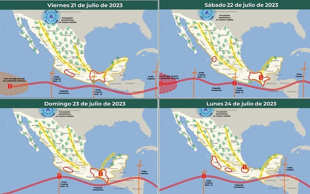 Mientras que al norte del país, el monzón mexicano producirá lluvias puntuales muy fuertes que podrían generar escurrimientos, deslaves e inundaciones en Sonora, Chihuahua, Durango y Sinaloa.