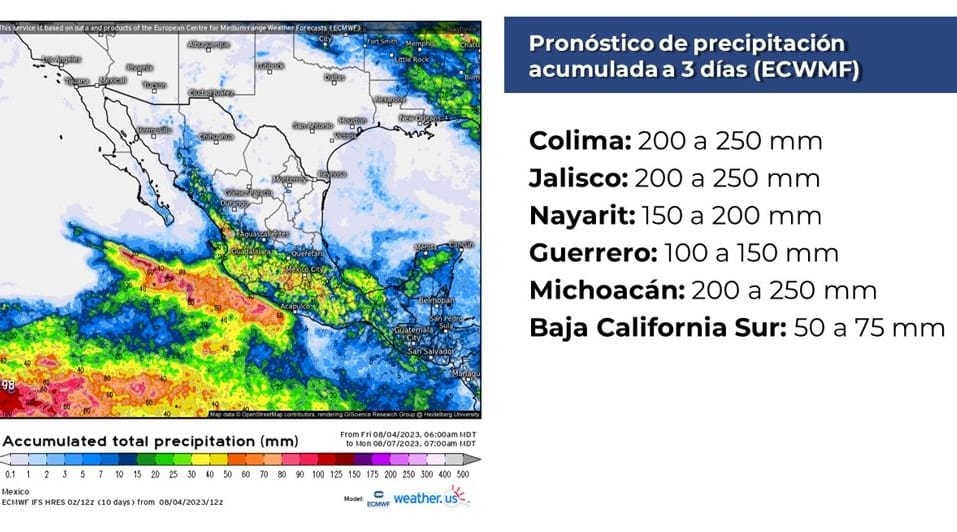 Para este sábado, el organismo dependiente de la Comisión Nacional del Agua (Conagua), prevé que en la franja costera de Colima –Armería, Tecomán y Manzanillo- puedan registrarse lluvias muy fuertes con puntuales intensas de hasta 150 milímetros, al igual que en la costa de Jalisco, Michoacán, Morelos y Guerrero.