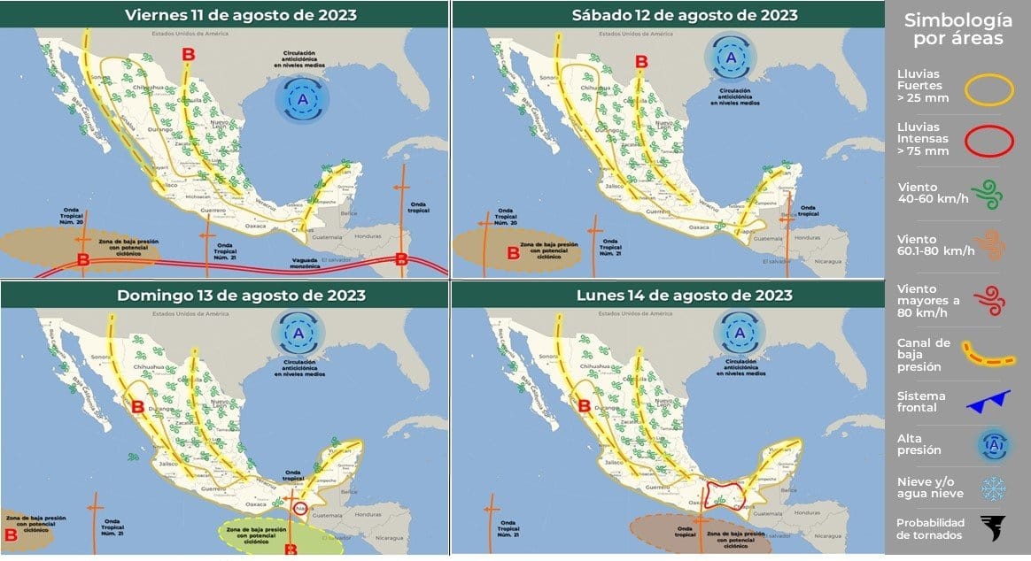 Durante la tarde y madrugada de este viernes 11 de agosto, un canal de baja presión con probabilidad de desarrollo ciclónico al suroeste de las costas de Jalisco, incrementará la probabilidad de lluvias muy fuertes en Michoacán y precipitaciones pluviales puntuales fuertes en Colima, Nayarit y Jalisco, por lo que la Unidad Estatal de Protección Civil (UEPC) del Gobierno del Estado de Colima pidió a la población a estar pendiente de las condiciones climáticas y atender las recomendaciones de las autoridades.