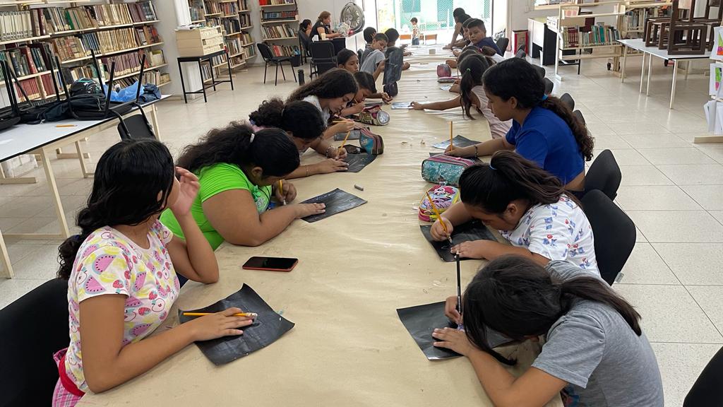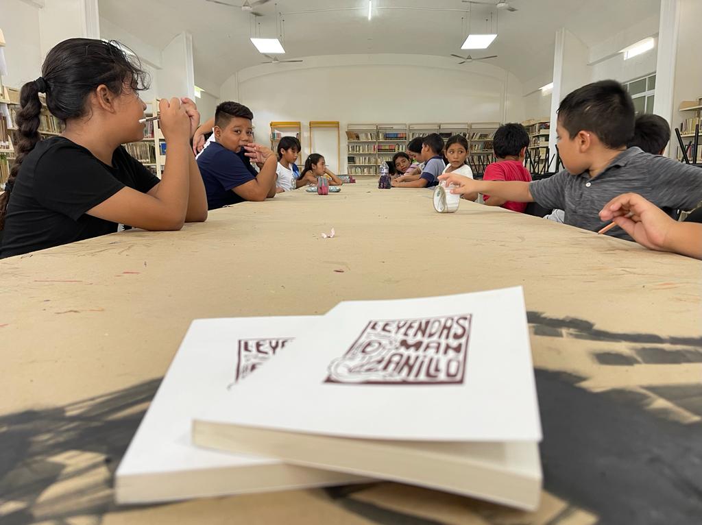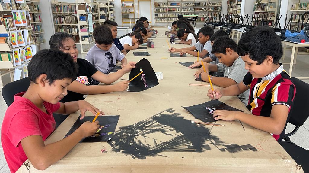 En la Biblioteca de Campos se les ofreció a los menores, clases de esgrafiado y fomento a la lectura; en las que aprendieron a preparar sus hojas con crayola y pintura negra, para luego plasmar imágenes creativas relacionadas con las lecturas del libro de Leyendas de Manzanillo: La leyenda del cerro de la Cruz, El gentil (2), El diablo en la discoteca, El Silbón.