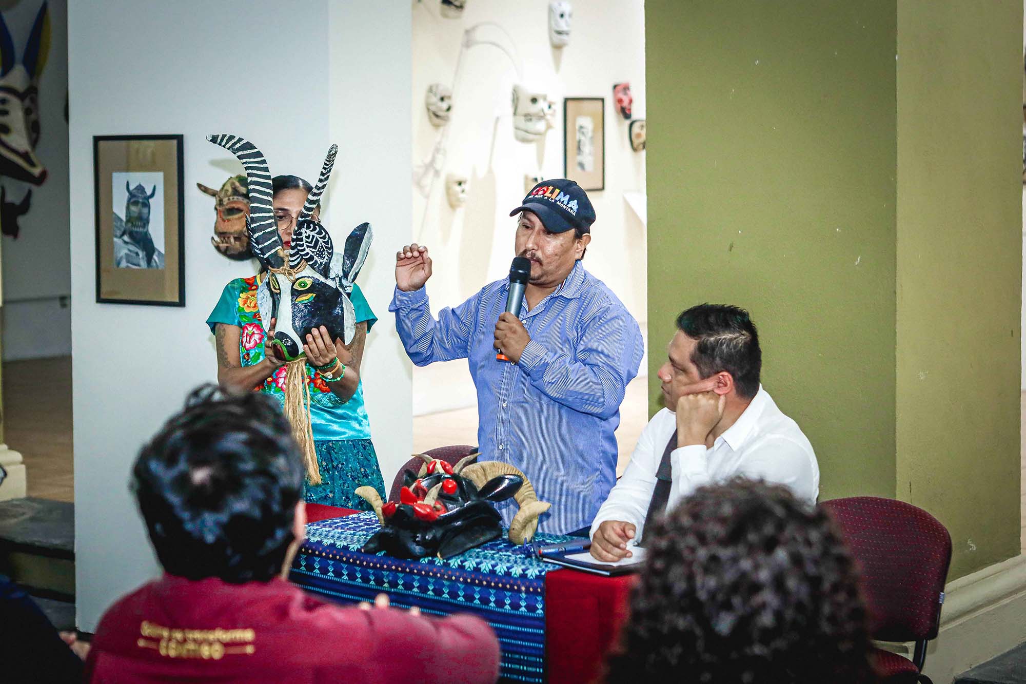 En la apertura, realizada en el marco del Día Internacional de los Pueblos Indígenas, el artesano colimense Guadalupe Candelario señaló que su conocimiento proviene de una larga tradición familiar en la elaboración de máscaras y, así como su padre Herminio le transmitió estos saberes desde muy corta edad, también involucra a sus hijas en las danzas y rituales tradicionales de Suchitlán; “por su parte, mi hijo mayor es el encargado de los Paspaques de Suchitlán, un ritual que celebra el ciclo agrícola del maíz”.