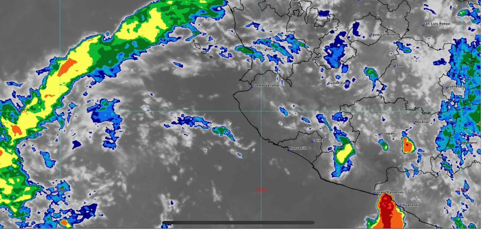 En el Pacífico Centro el SMN prevé cielo medio nublado a nublado con probabilidad de lluvias puntuales muy fuertes en Colima, Jalisco y Nayarit, las cuales estarán acompañadas de descargas eléctricas, rachas fuertes de viento y posible caída de granizo, lo cual podría reducir la visibilidad, originar el incremento en niveles de ríos y arroyos, así como generar deslaves, inundaciones y encharcamientos.