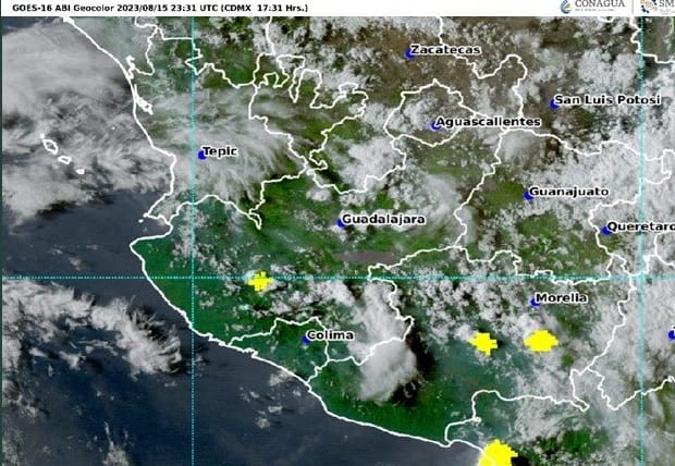 Para este miércoles 16 de agosto, el Servicio Meteorológico Nacional (SMN) prevé que en algunos municipios de Colima, se registrarán lluvias fuertes con puntuales muy fuertes de hasta 75 milímetros, lo mismo para Nayarit, Jalisco, Puebla y Tabasco.