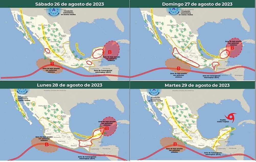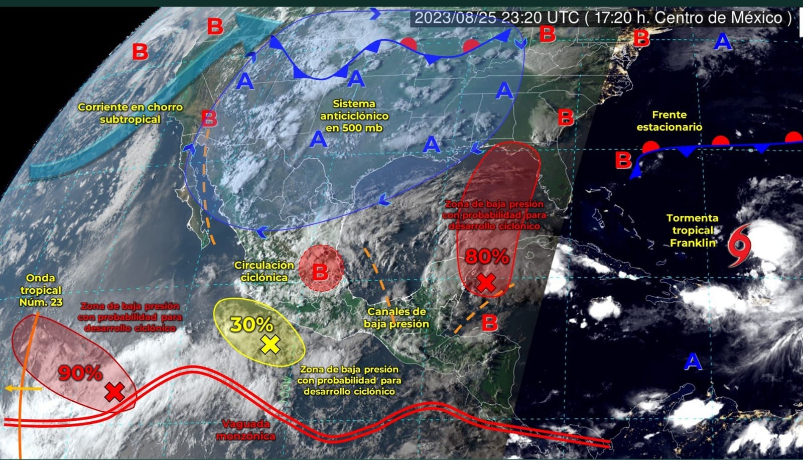 Para este sábado 26 de agosto, el organismo de la Comisión Nacional del Agua (Conagua) prevé que en algunos municipios de Colima puedan registrarse lluvias fuertes con puntuales muy fuertes de hasta 75 milímetros, al igual que en Jalisco, Michoacán, Guerrero, Tamaulipas, San Luis Potosí, Puebla, Hidalgo, Veracruz, Oaxaca y Tabasco.