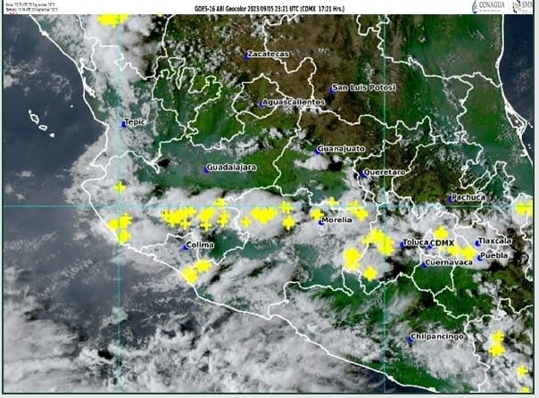 En el pronóstico de lluvias para este miércoles 6 de septiembre, Conagua anticipa probables lluvias muy fuertes con puntuales intensas (de 75 a 150 milímetros) en Puebla, Guerrero, Oaxaca, Chiapas y Veracruz, así como lluvias fuertes con puntuales muy fuertes (de 50 a 75 mm) en Colima, Jalisco, Michoacán, Estado de México, Sinaloa, Nayarit, Morelos y Tabasco.
