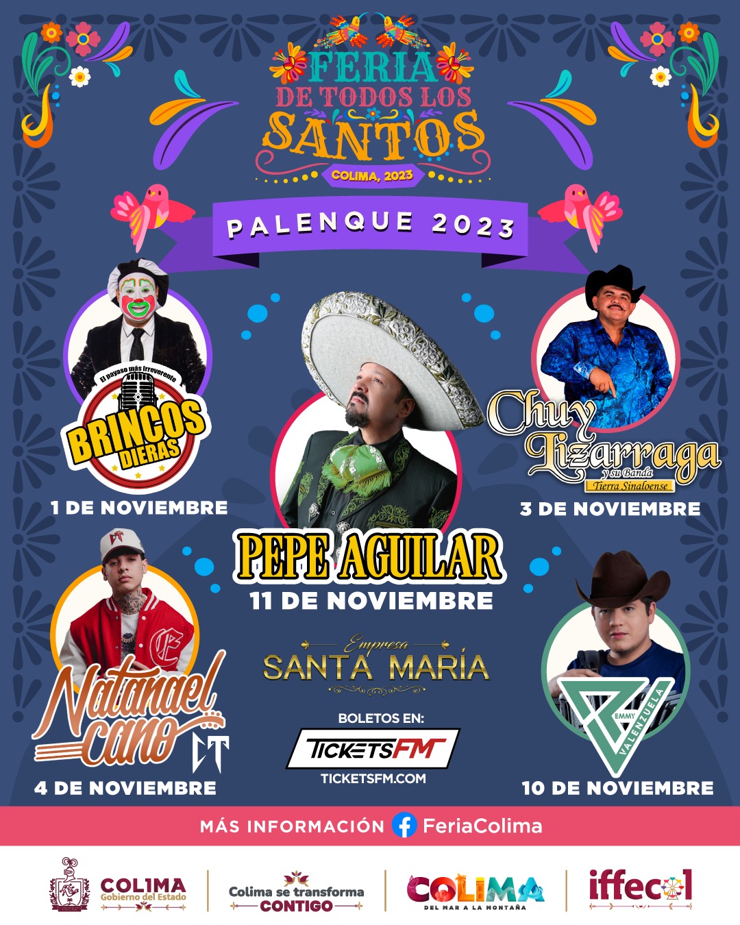 La cartelera la integran: Brincos Dieras el 1 de noviembre, Chuy Lizárraga el 3 de noviembre, Natanael Cano el 4 de noviembre, Remmy Valenzuela el 10 de noviembre, Pepe Aguilar el 11 de noviembre. La venta de boletos inicia el 15 de septiembre a las 12 horas en Plaza San Fernando, mientras que los boletos generales estarán en Rocha Hats (Villa de Álvarez), Paletería Golucci (Soriana Villa de Álvarez), Wuaco Boutique (Colima) y la venta en línea iniciará el 18 de septiembre a las 12 horas en ticketsfm.com