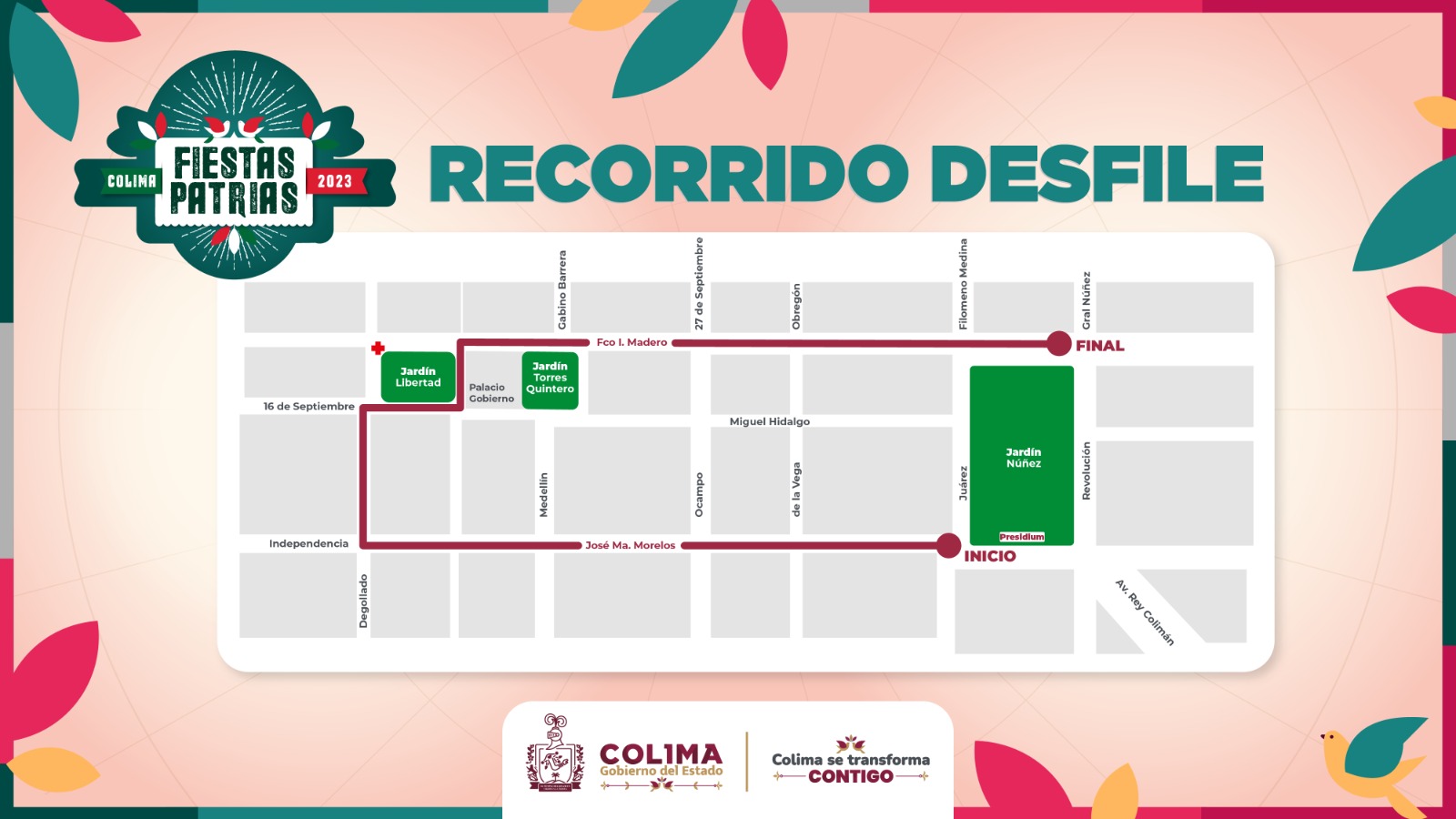 El Gobierno del Estado de Colima invita a toda la población a disfrutar del desfile conmemorativo por el 213 aniversario del inicio de la Independencia de México que se realizará este sábado 16 de septiembre, desde las 9:00 de la mañana, con la indicación de salida de la gobernadora Indira Vizcaíno Silva, en las calles Benito Juárez y José María Morelos (esquina suroeste del Jardín Núñez), en la capital colimense.