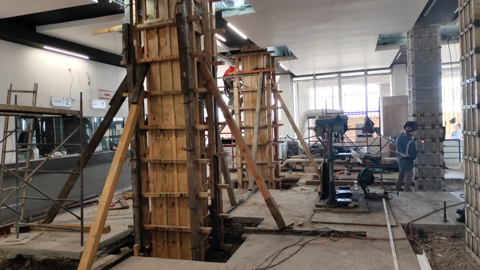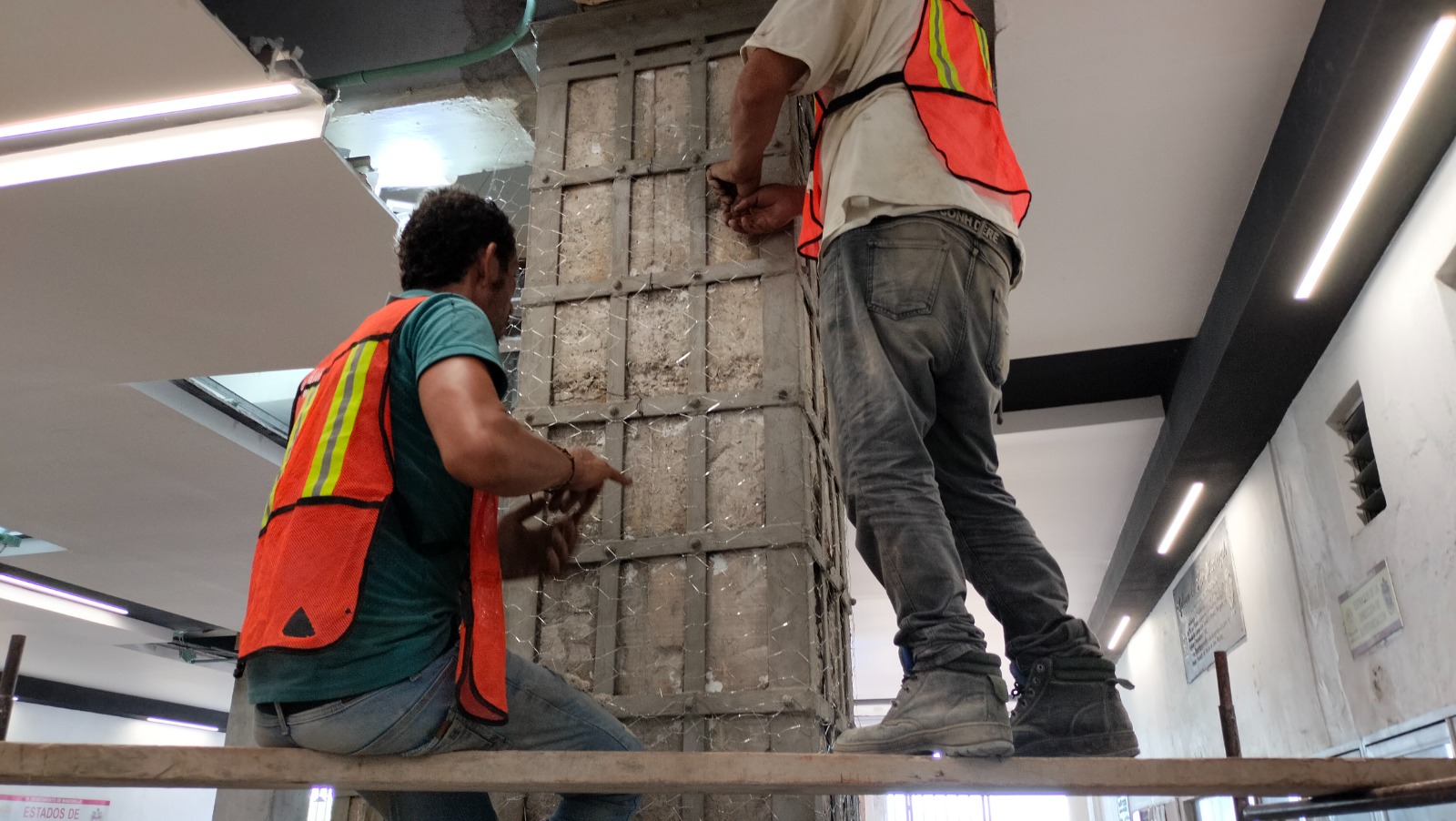 De acuerdo con los trabajos que se realizan, bajo la supervisión de la dirección general de Obras Públicas Municipales se realiza el reforzamiento de columnas en el área del acceso principal del edificio y del vestíbulo; con perforaciones para el anclaje y colocación de acero de refuerzo, para posteriormente colocar concreto hidráulico.