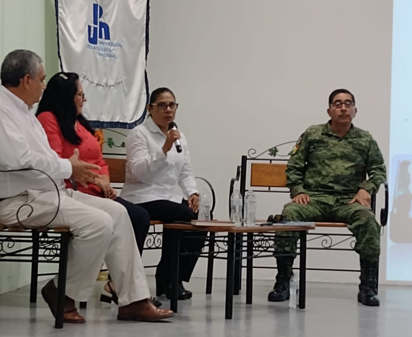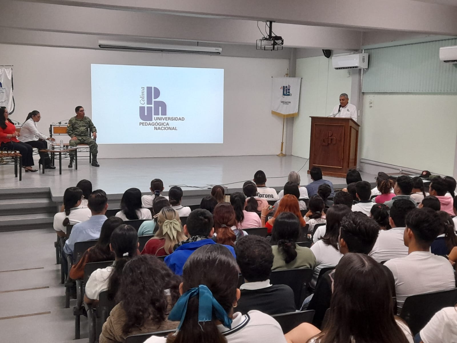 Este jueves, en el marco del Día Internacional de la Paz, la Unidad 061 de la Universidad Pedagógica Nacional, recibió como invitados especiales a los representantes de la 20/a Zona Militar, quienes en voz del General Brigadier Diplomado de Estado Mayor, Comandante Adolfo Héctor Tonatiuh Velasco Bernal, compartieron a la Comunidad Universitaria, la conferencia “Difusión de la Cultura de Seguridad Nacional”, en la que además de analizar los diferentes conceptos de la seguridad nacional y sus implicaciones, motivó la presentación de los antecedentes y parámetros que fijaron la noción de seguridad y seguridad nacional, desde los teóricos y hasta su registro conceptual en los planes de desarrollo de los gobiernos de los años 80´s.