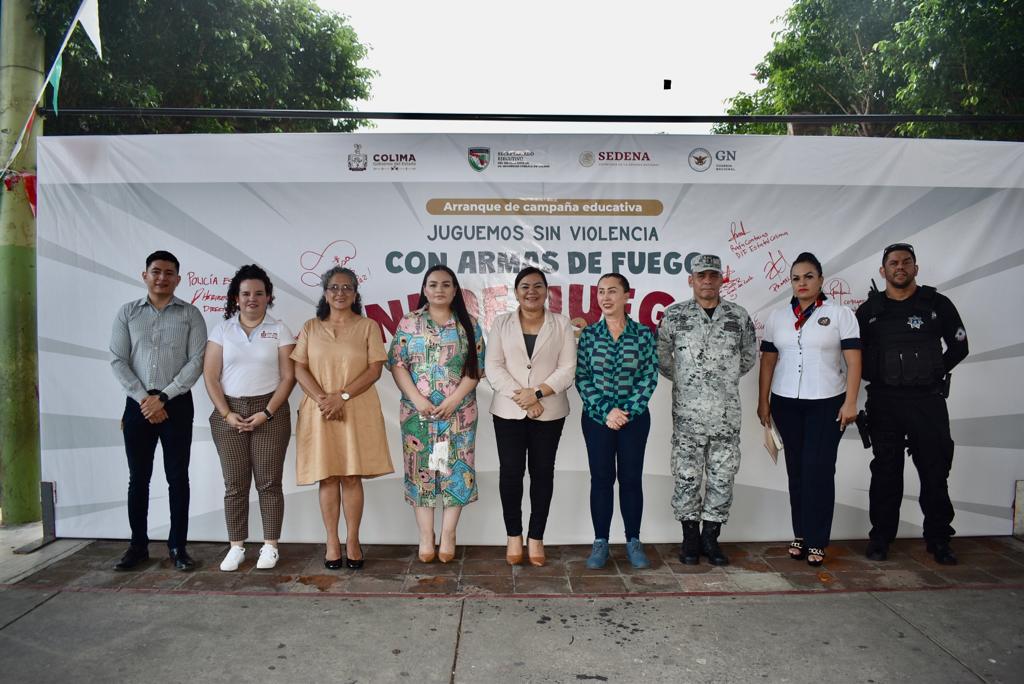La secretaria general de Gobierno, Ma Guadalupe Solís Ramírez, acompañada de la presidenta municipal de Villa de Álvarez, Esther Gutiérrez Andrade, encabezó la tarde de este jueves la inauguración de la campaña denominada ‘Juguemos sin violencia: con armas de fuego ni de juego’ en su edición 2023, con el objetivo de fomentar el uso de juguetes y juegos lúdicos y evitar a toda costa los juegos bélicos entre las y los niños colimenses.
