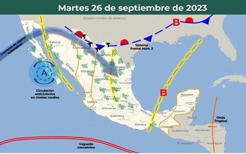 Para este martes 26 de septiembre, el SMN también prevé temperaturas máximas de hasta 40 grados Celsius en el estado de Colima, al igual que en Jalisco, Michoacán, Guerrero, Oaxaca, Chiapas, Baja California, Durango, Coahuila, Nuevo León, Tamaulipas, San Luis Potosí, Veracruz, Nayarit, Tabasco, Campeche, Yucatán y Quintana Roo.