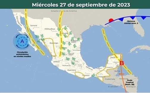 Un canal de baja presión se extenderá sobre el Golfo de México y el sureste del país, junto a una onda tropical en la Península de Yucatán y el ingreso de humedad del Mar Caribe, producirán chubascos y fuertes lluvias con posibles descargas eléctricas.